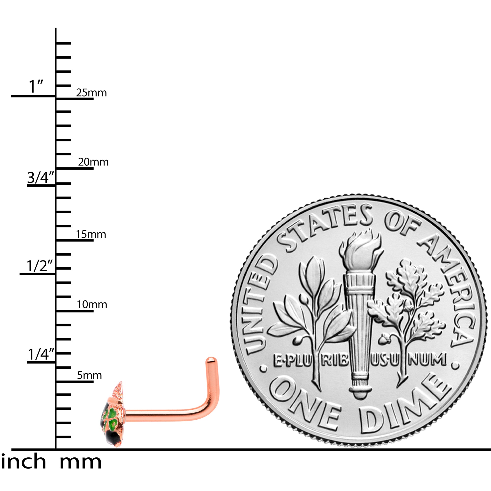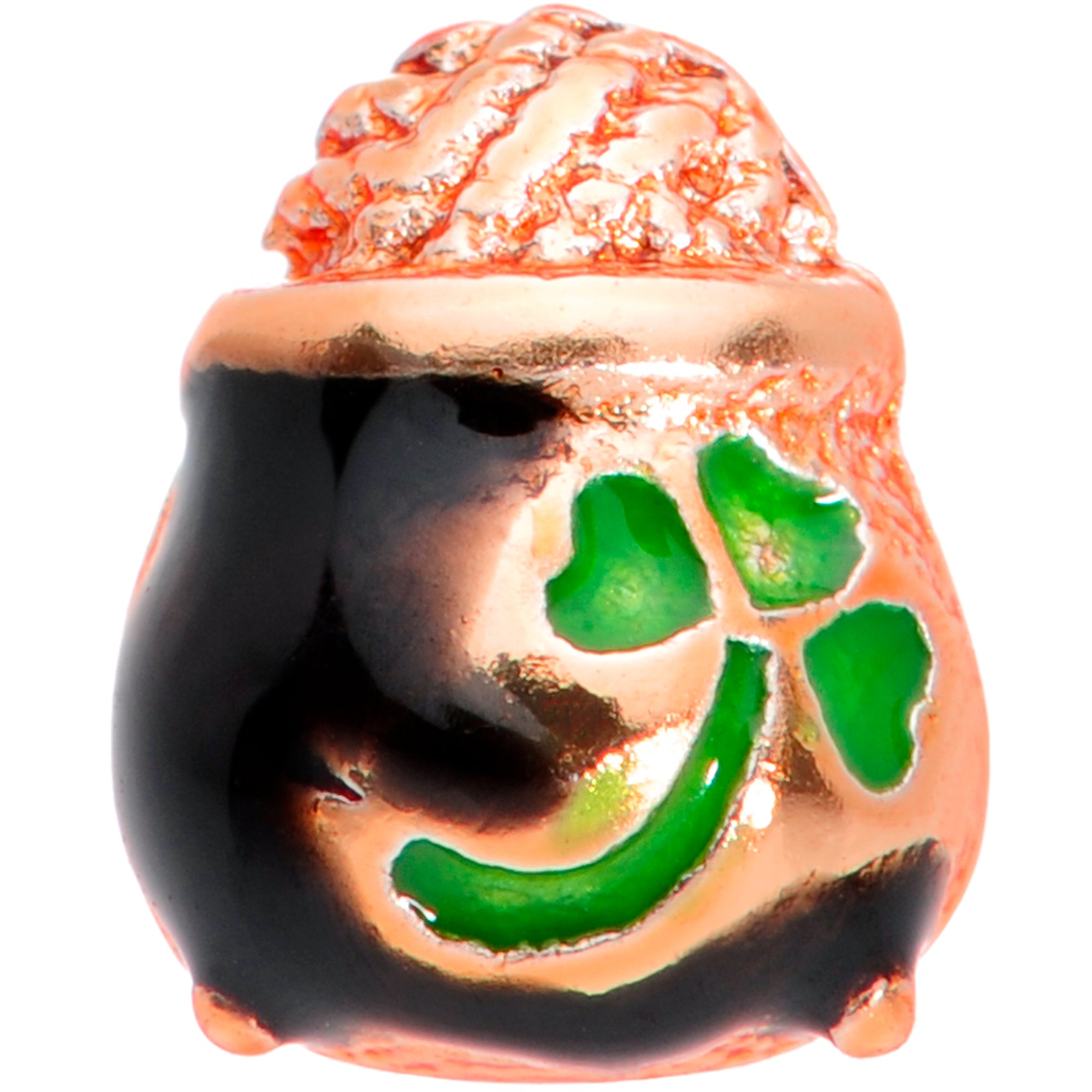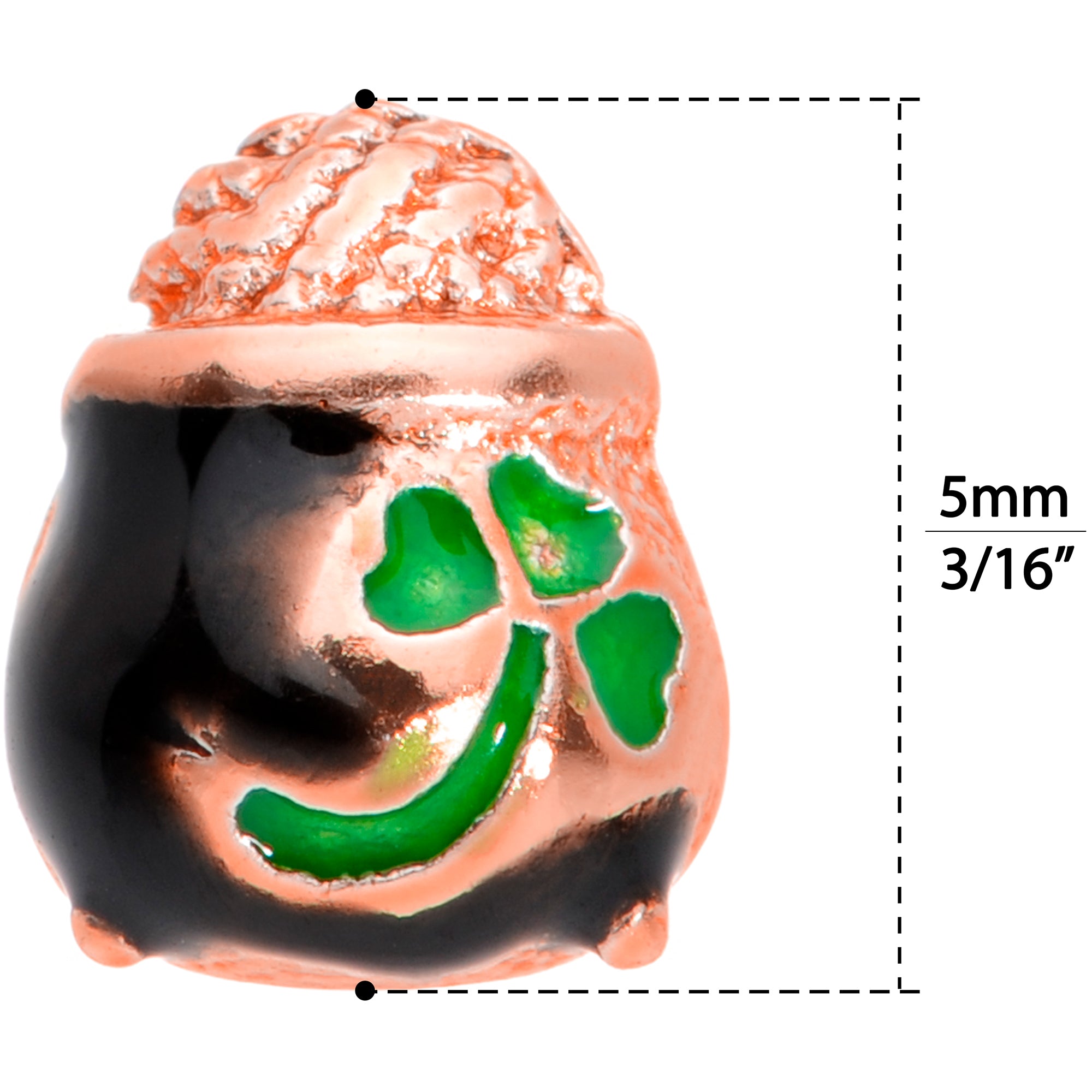 Don't let your nose piercing go without some holiday bling this St. Patrick's Day! This 18 gauge nostril jewelry is made with an 8mm length at the bend rose gold tone anodized over 316L surgical grade stainless steel post. It features a black shamrock pot of gold charm end filled with treasure that will have everyone who sees it saying "Cheers" to the Irish!