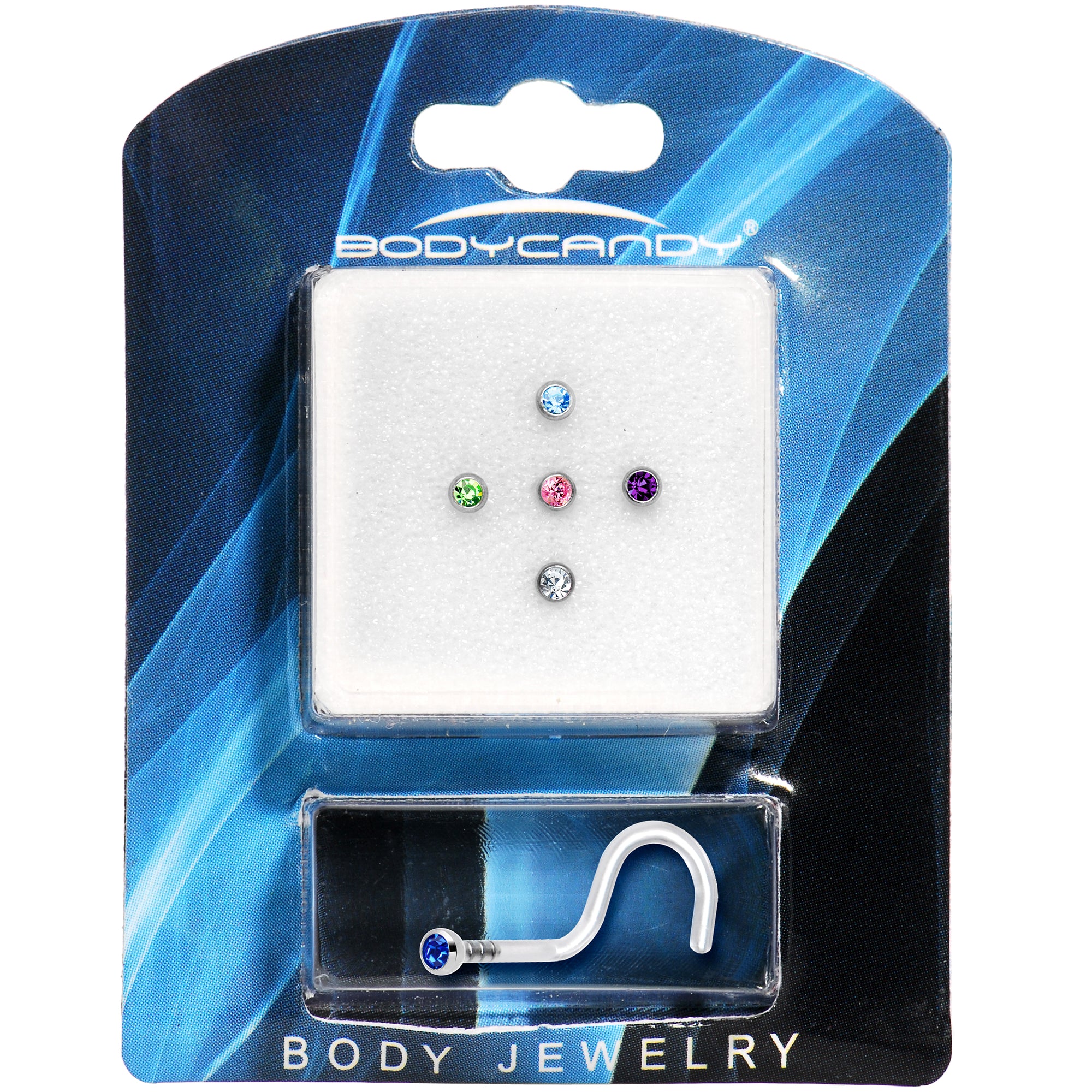 Hypoallergenic jewelry for sensitive skinDon't miss out on this bonus pack of 18 gauge nose screw rings! These dazzling gem nose rings are crafted featuring a flexible Bioplast nose screw. This five-pack of nose rings includes a light blue, dark blue, pink, clear, green, and purple crystal nose screw ring. Sparkling cubic zirconia nose ring bonus pack.