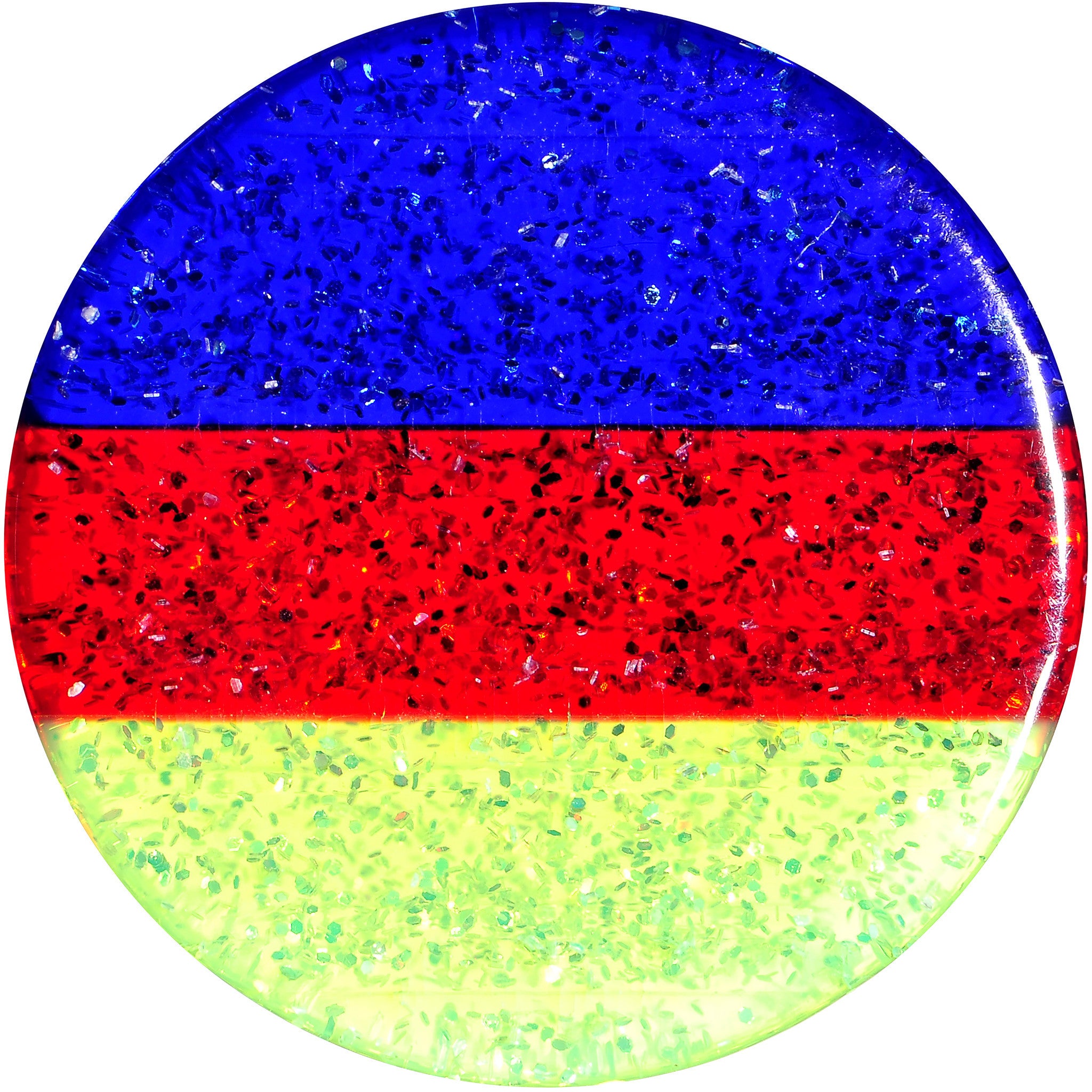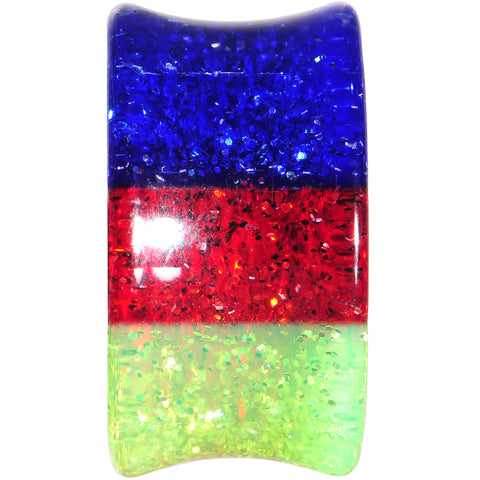 Hypoallergenic jewelry for sensitive skin.Sold individually, purchase 2 for a pair. Be the life of the party with this colorful, glitter-filled acrylic ear expander. Red, green, and blue striped solid acrylic 18mm double flare ear stretcher saddle plug. Pierced body jewelry ear gauge plug.