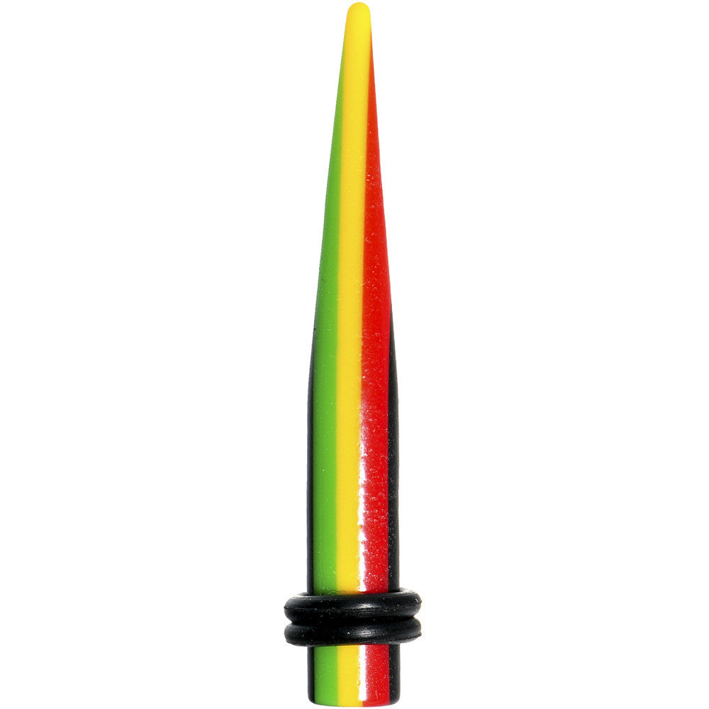Hypoallergenic jewelry for sensitive skin.Sold Individually, Please purchase a quantity of 2 for a pair. Go wickedly Rasta when you pop in this fun red, yellow, and green pinstriped taper. Acrylic Rasta straight taper with cool colored stripes. 2 gauge taper plug Body Jewelry./font>