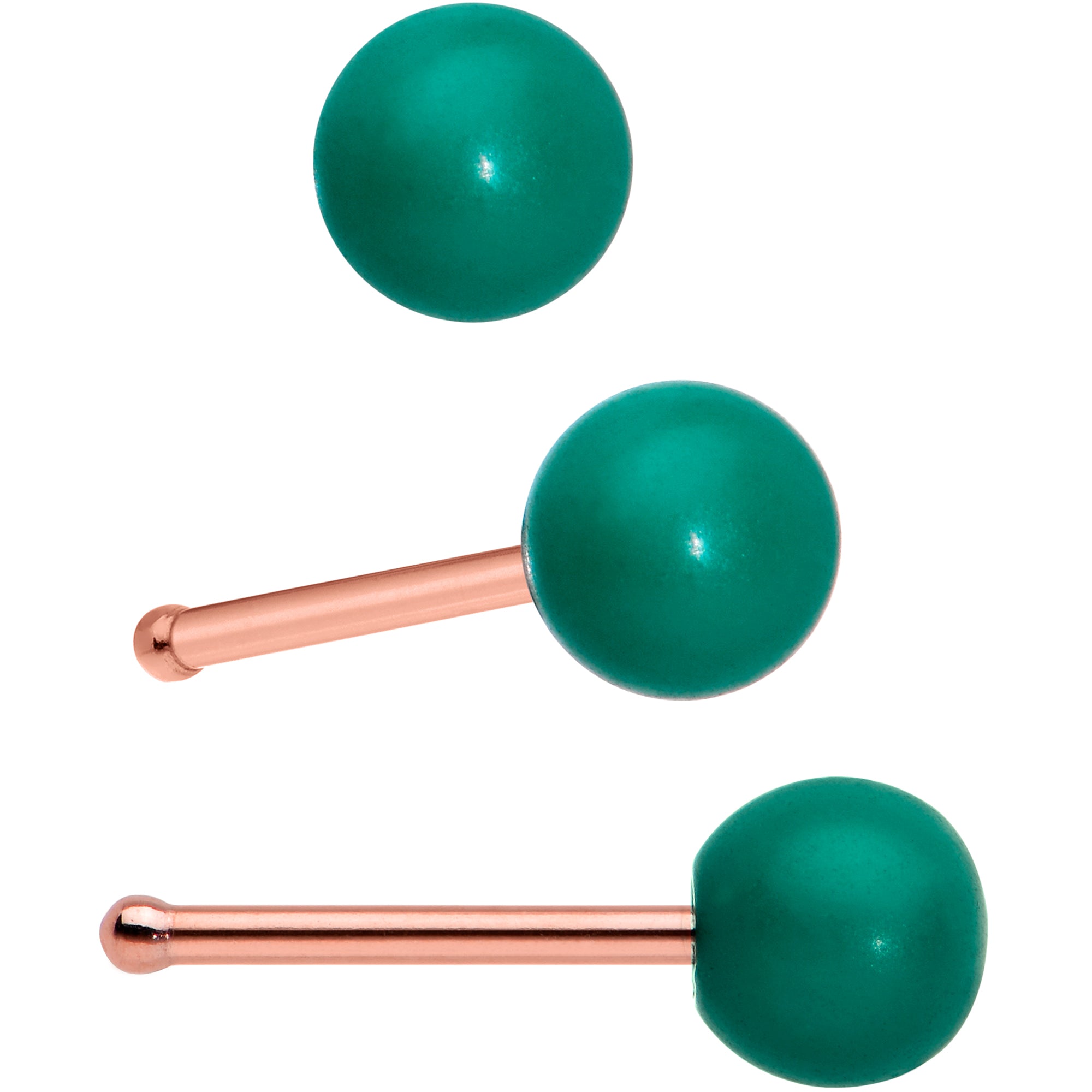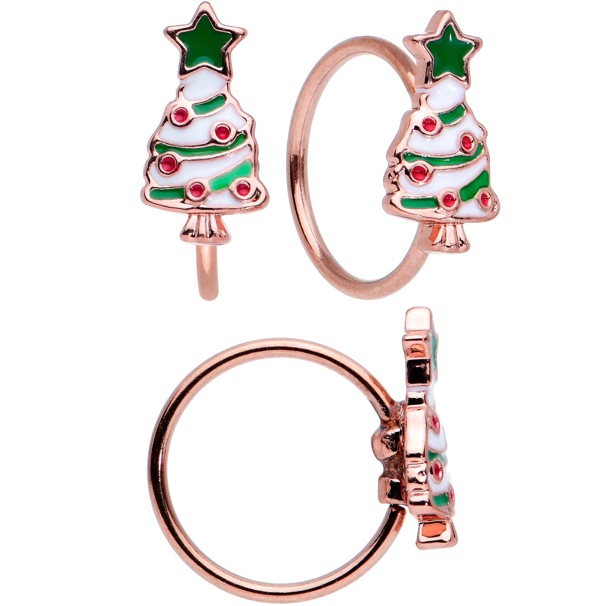 You'll have all the days of Christmas covered with this set of 20 gauge nostril rings! One is made with an 8mm rose gold tone PVD over 316L surgical grade stainless steel circular ring. It features a Christmas tree charm, embellished with red gem ornaments and a green star topper. The second is made with a 6mm length at the bend rose gold tone PVD over 316L surgical grade stainless steel L-shaped post. It features a snowman charm, wearing a jaunty red hat and a happy smile. The other two are made with 6mm rose gold tone PVD over 316L surgical grade stainless steel straight posts and each features a ball end in festive red or green. You'll be all dressed for the season and ready to go with this festive set of nose piercing jewelry! Sold as a set of four.