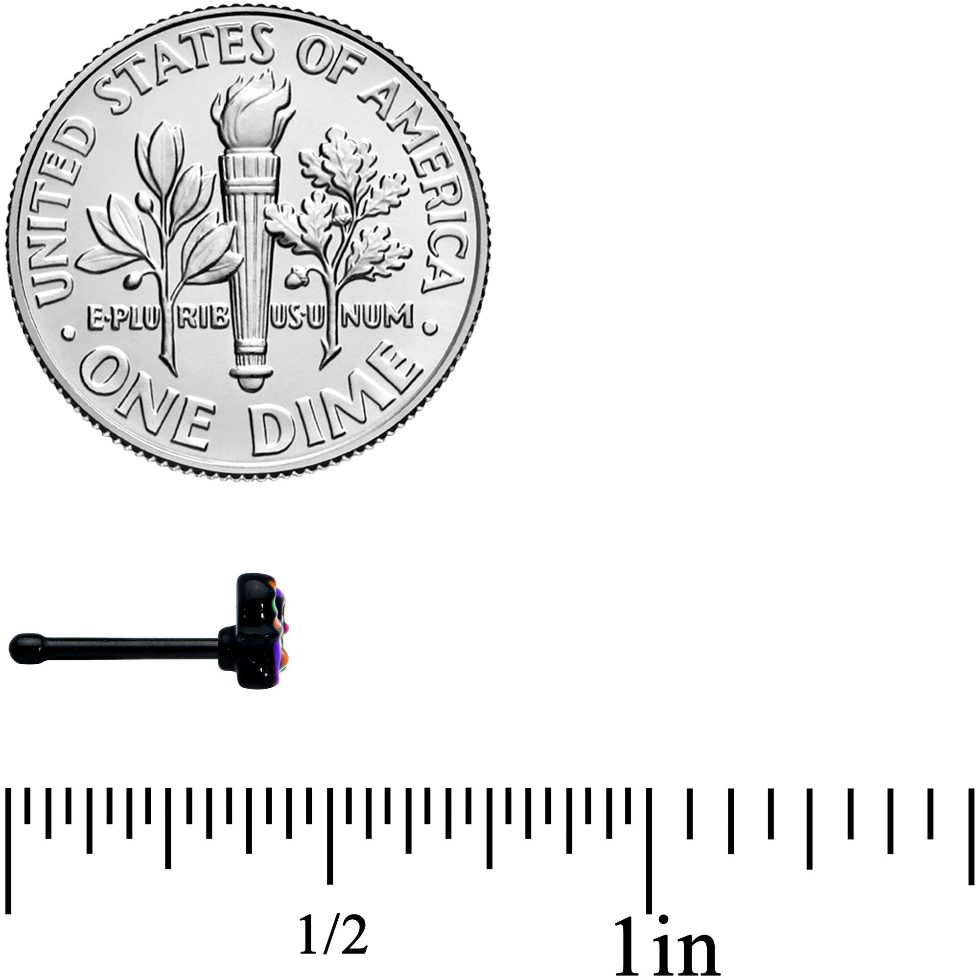 Make every day a Halloween party with this 20 gauge nostril ring! It's made with a 6mm black PVD over 316L surgical grade stainless steel straight post. It features a charm of the word "boo" with the B wearing a striped witch's hat. The O is a jack o'lantern and the second O has a black cat peeking over it. You'll definitely want to invite these characters to add some Halloween style to your look with this fun and festive nose ring!