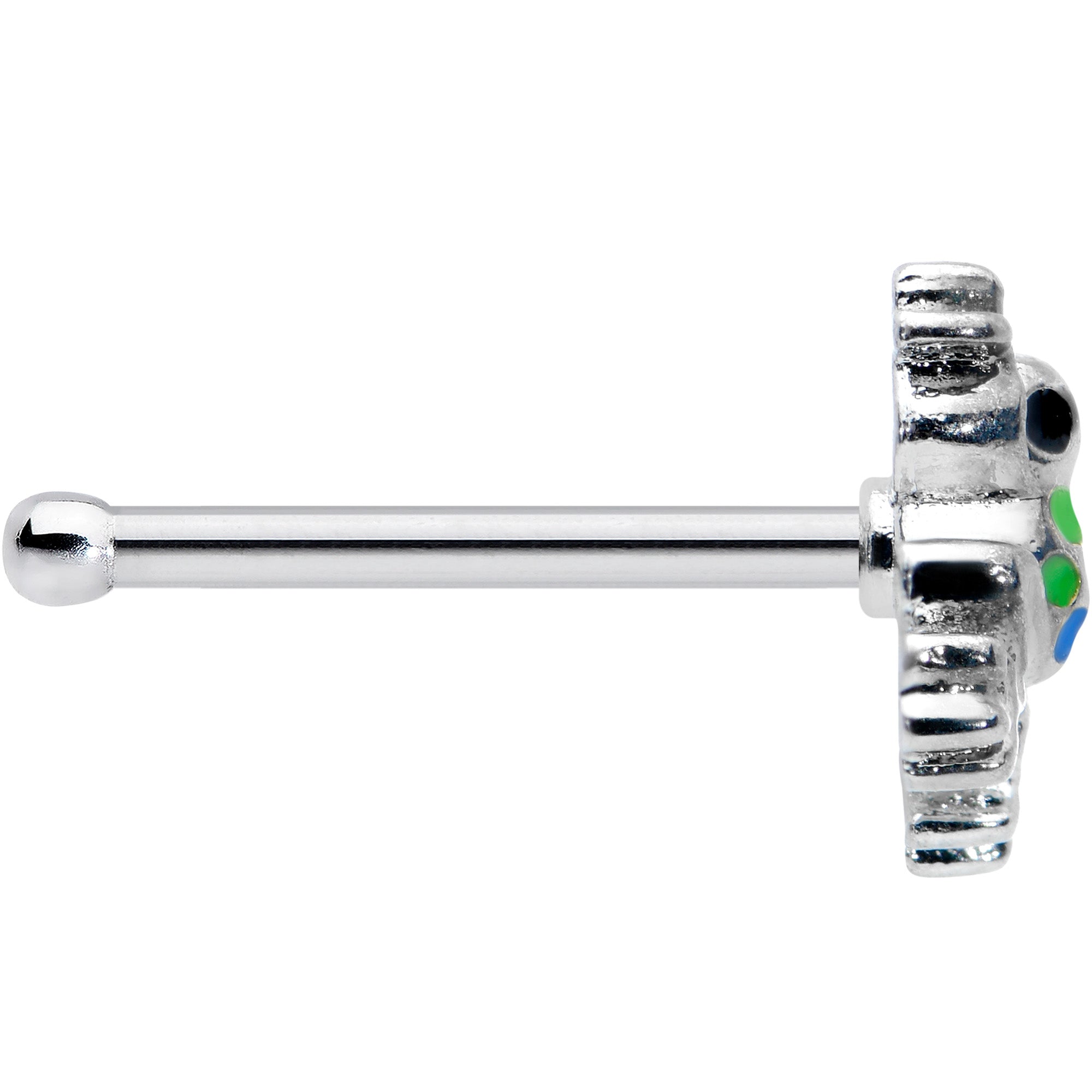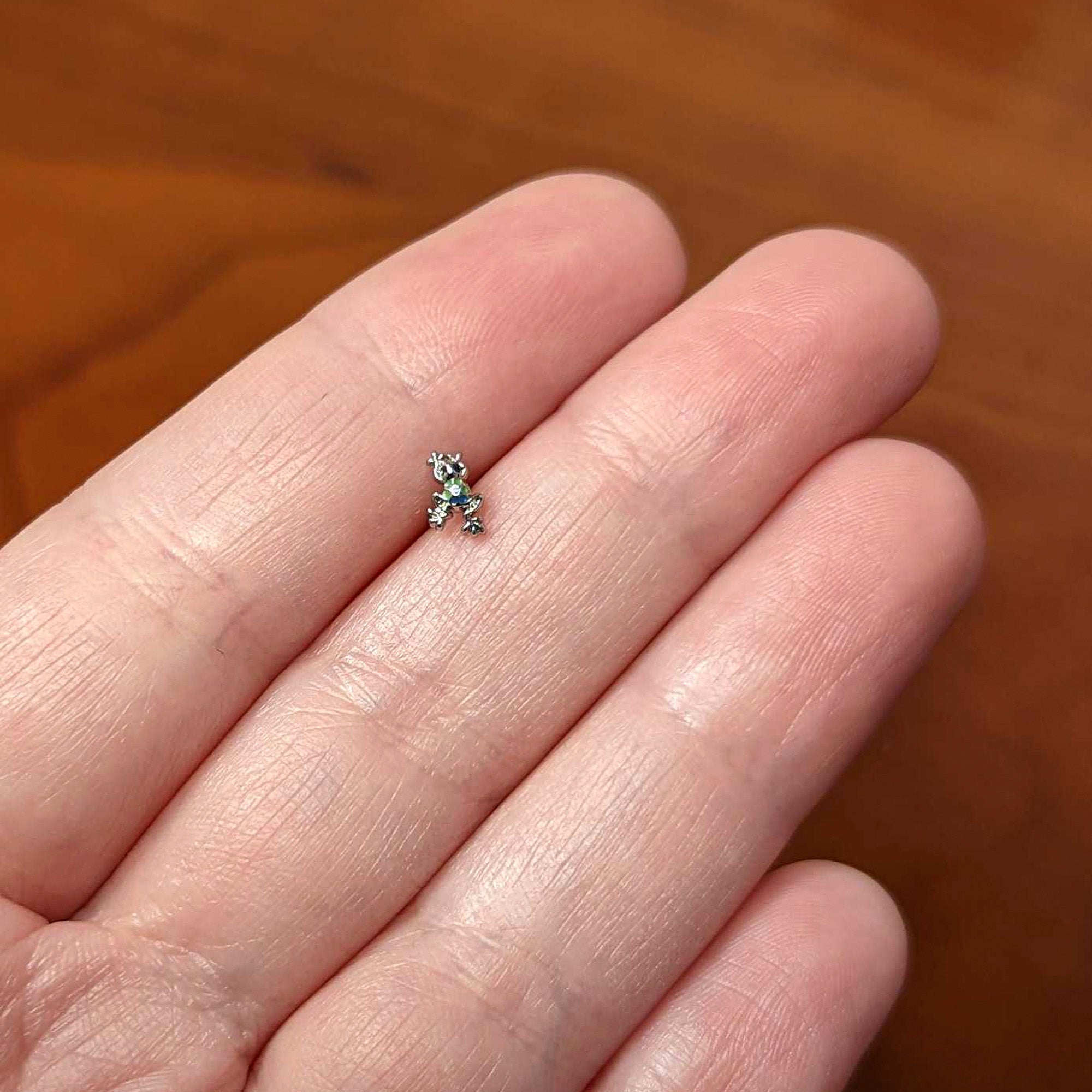 The frog on this 20 gauge nostril ring is adorably dotty! It's made with a 6mm durable 316L surgical grade stainless steel straight post. It features a frog charm, with black gem eyes. The frog is embellished with blue and green polka dots for a look that's both whimsical and colorful. This frog is freaking fantastic!