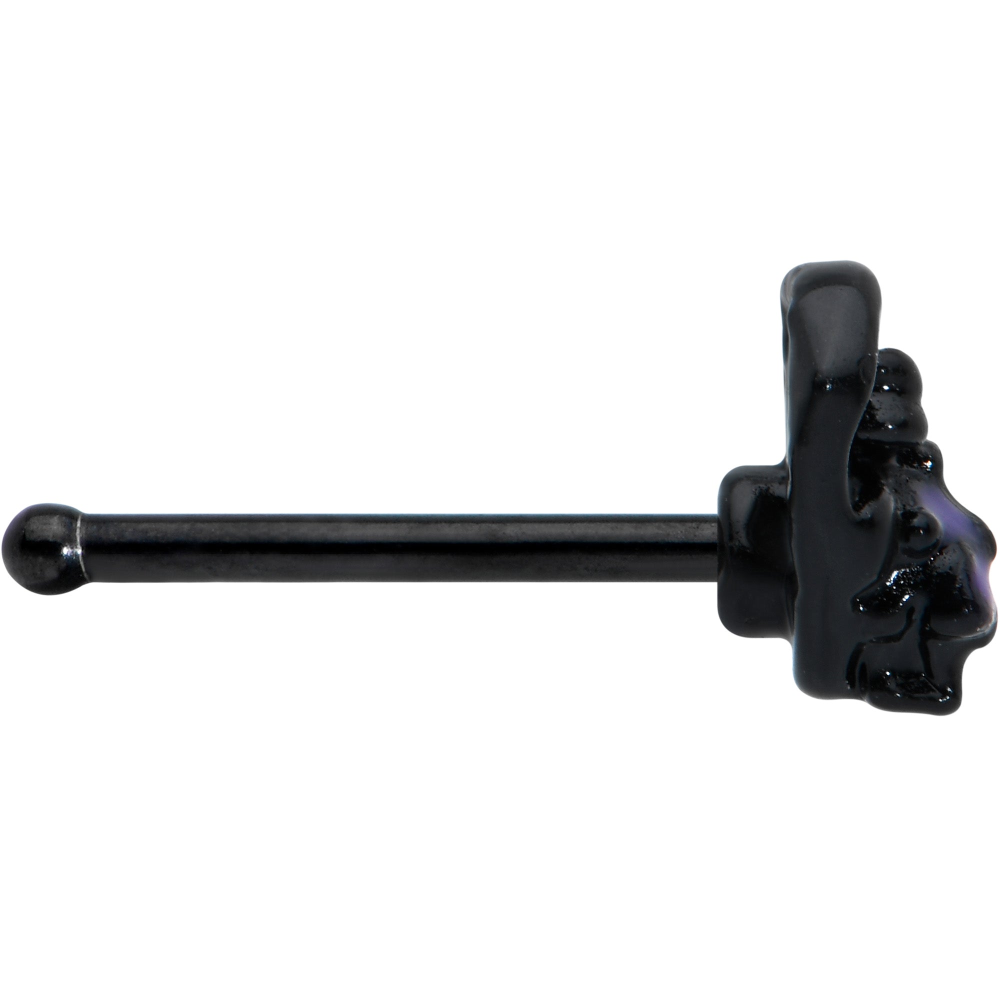 Fall in love with all things dark and creepy with this 20 gauge nostril ring! it's made with a 6mm black PVD over 316L surgical grade stainless steel straight post. It features a hollow heart charm. At the bottom of the heart is a skull, embellished with purple eyes. It's further embellished with purple inlay at the top of its head, where there's a black bow for a whimsical and cohesive look. This is one nose piercing ring you'll love all the way down to the bone!