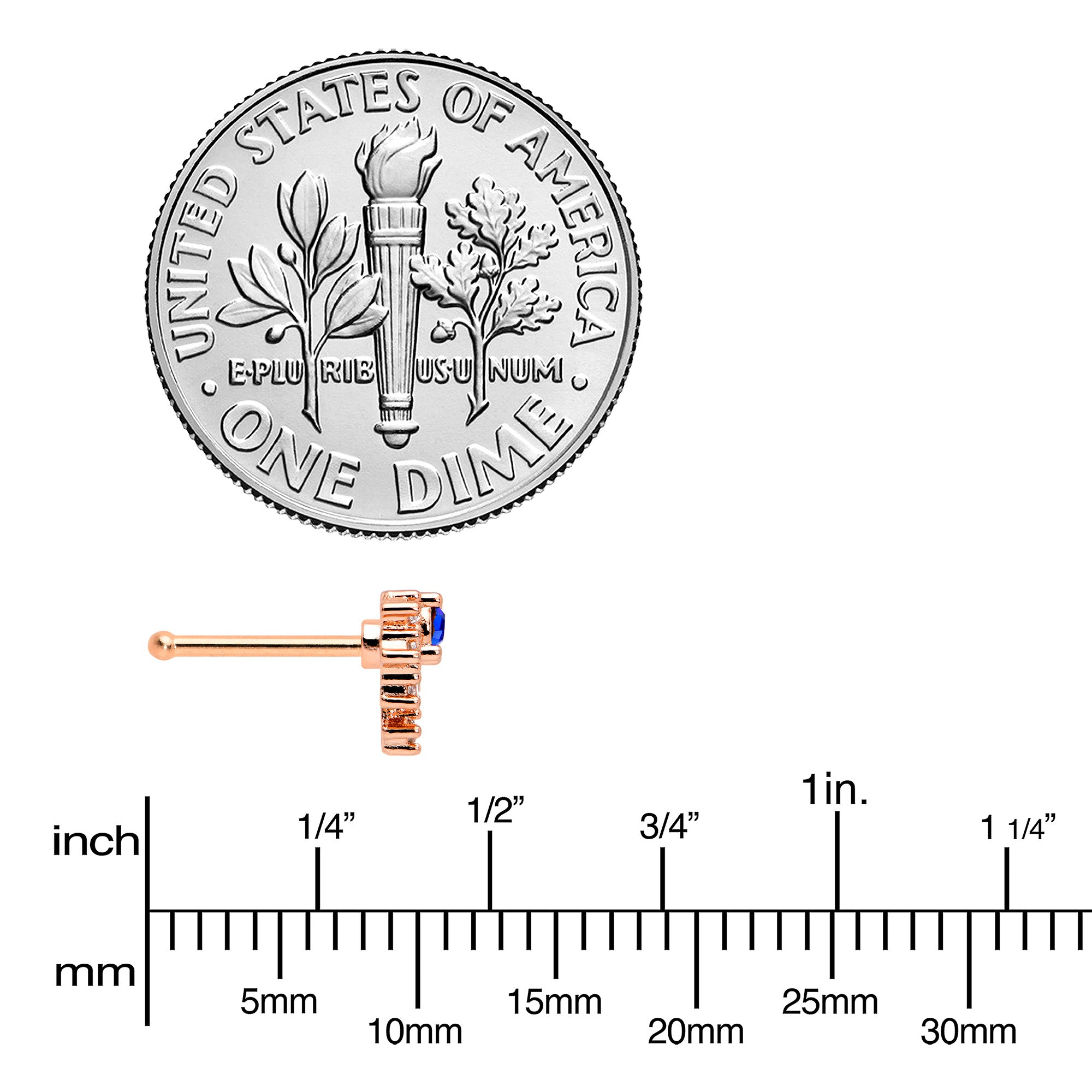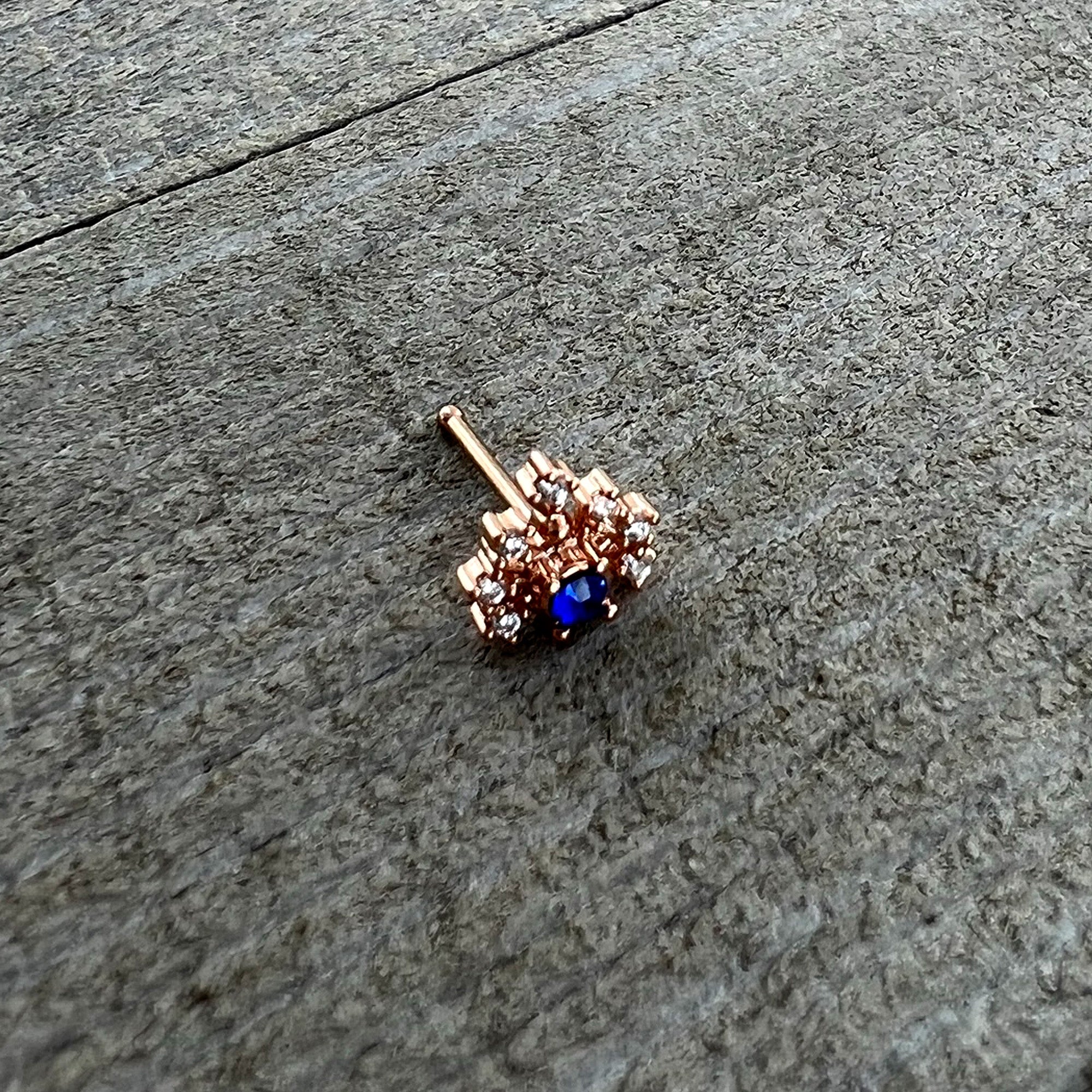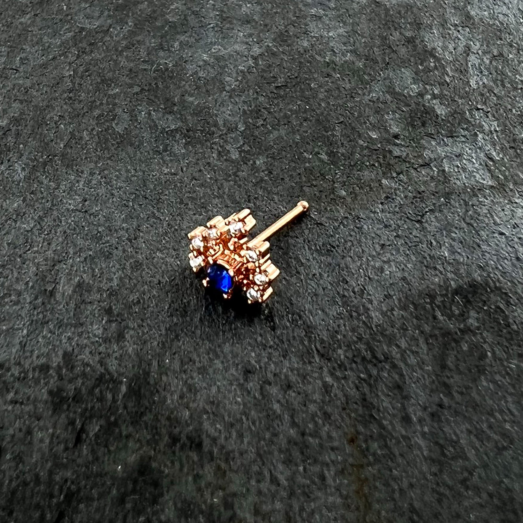The flare on this 20 gauge nostril ring is going to add a ton of flair to your look! It's made with a 6mm rose gold tone PVD over 316L surgical grade stainless steel straight post. It features a blue gem charm, surrounded by rays tipped with clear gem ends for a firey look! You'll be enjoying a fashion flareup when you're rocking this colorful nose piercing ring!