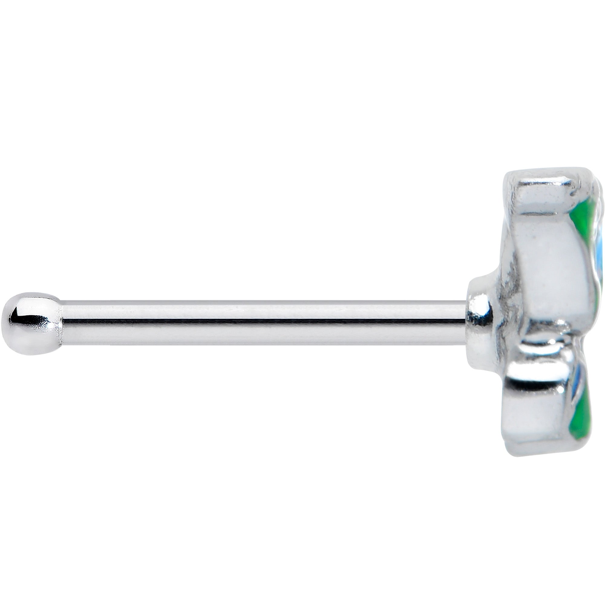 This 20 gauge nostril ring is one you can't help but notice! It's made with a 6mm durable 316L surgical grade stainless steel straight post. It features a butterfly charm, inlaid in bright shades of pink, blue, and green. The butterfly is further embellished with textured detailing for an added touch of glamour. Let your look spread its wings and soar into style with this bright and beautiful butterfly nose piercing ring!