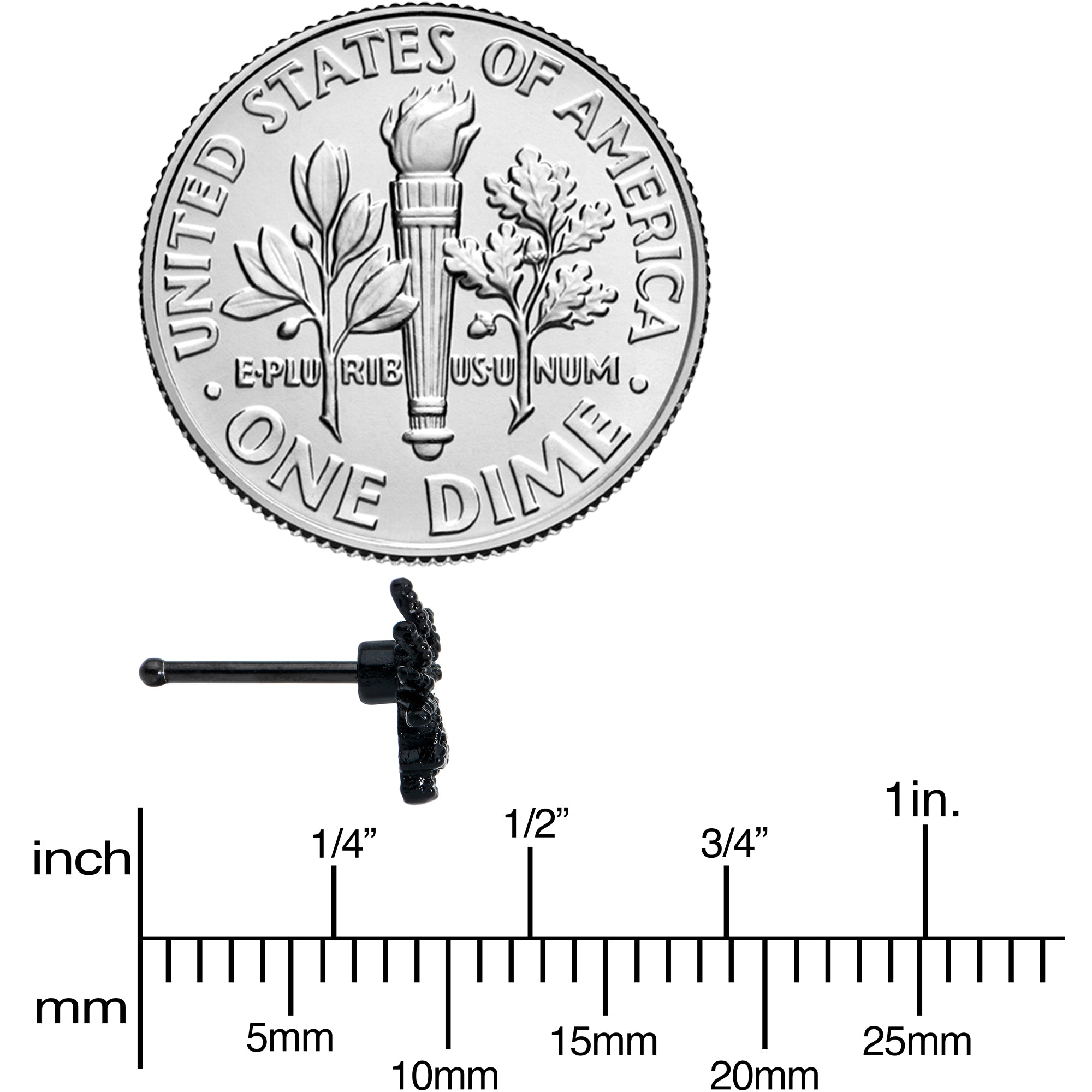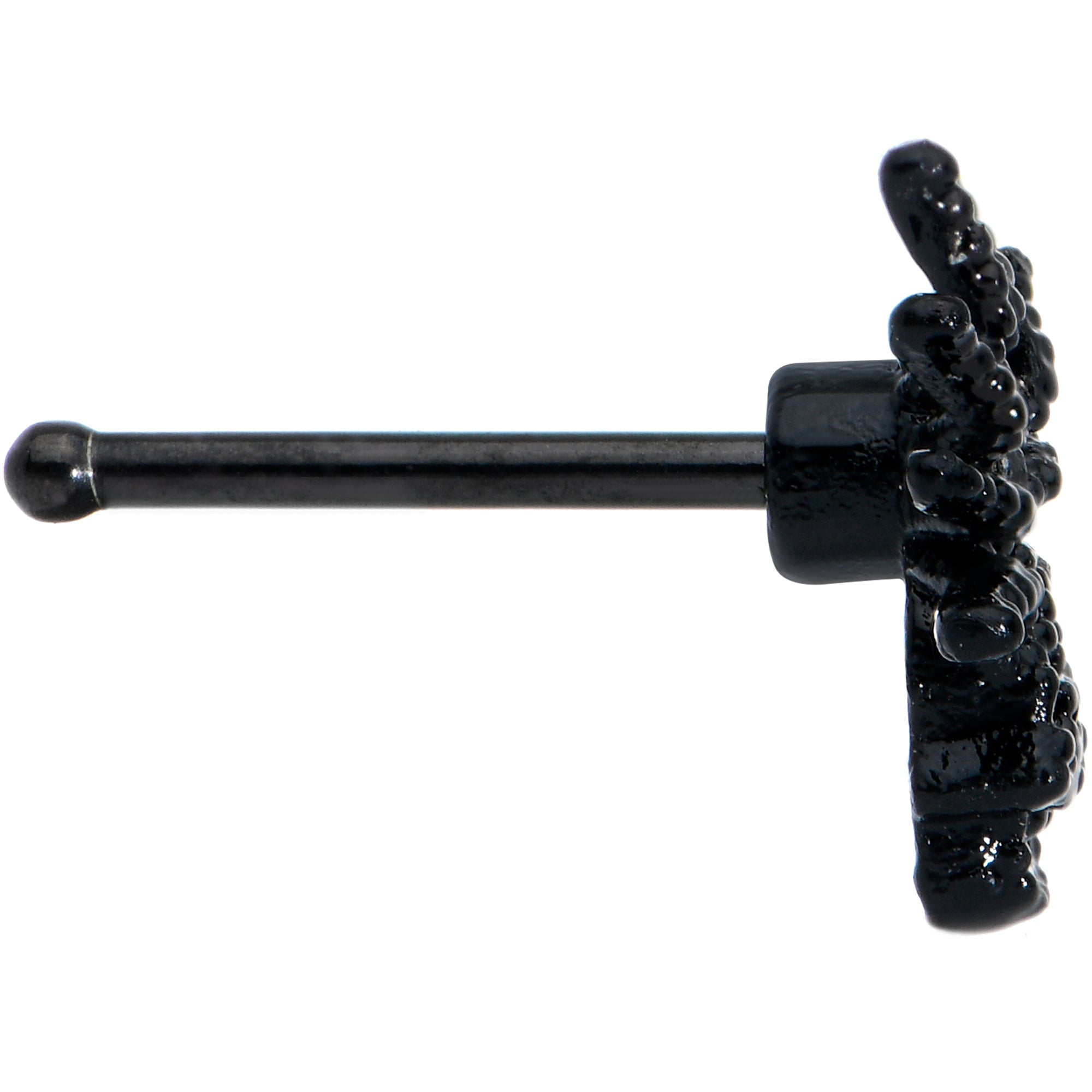 This creepy crawly critter has found a new home on this 20 gauge nostril ring! It's made with a 6mm black PVD over 316L surgical grade stainless steel straight post and features a large black spider charm. The spider has a black textured detailing on its body and a clear gem at the center, to draw the eye in a way that's subtle but impossible to ignore. So don't ignore this creepy critter, let it crawl into your nose piercing and spin a web of beauty!