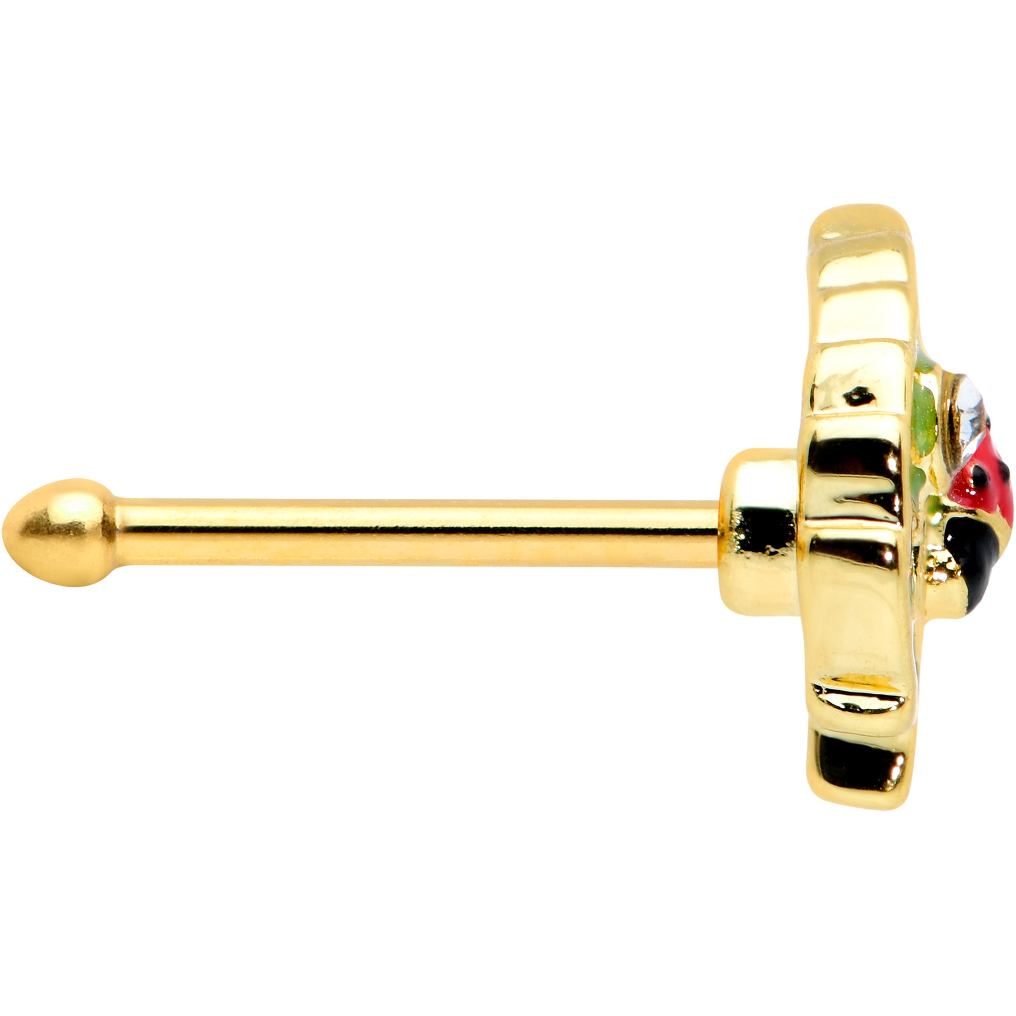 20 Gauge 1/4 Clear Gem Gold Tone Leafy Ladybug Nose Bone