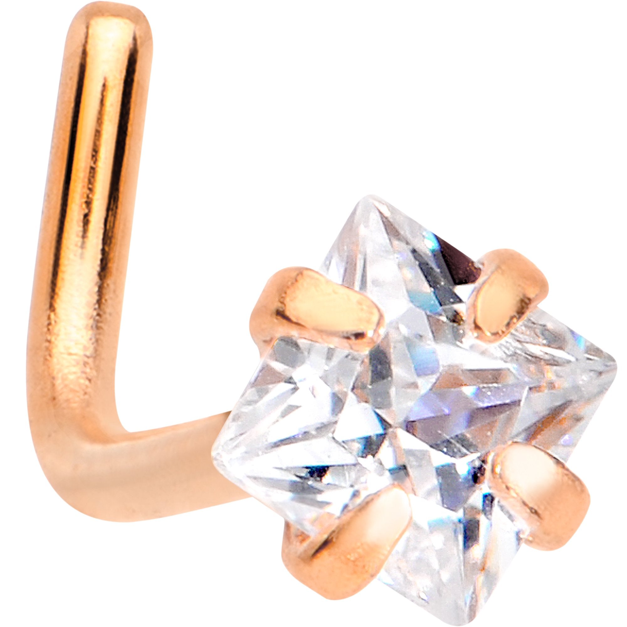 20G 1/4 Clear Square 2.5mm CZ Gem Rose Gold IP L-Shape Nose Ring