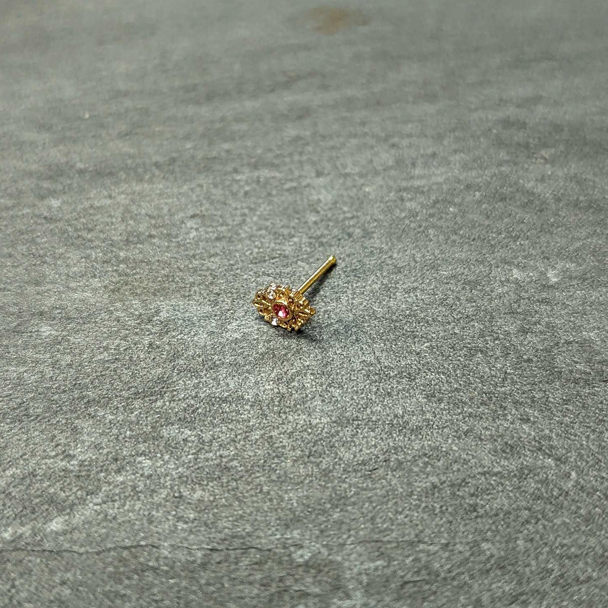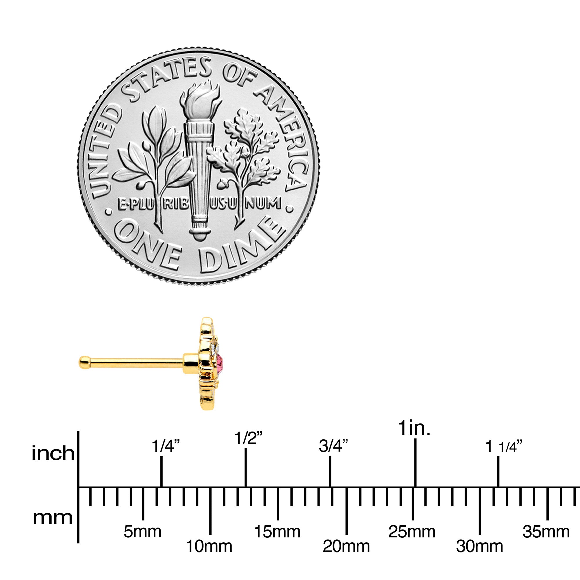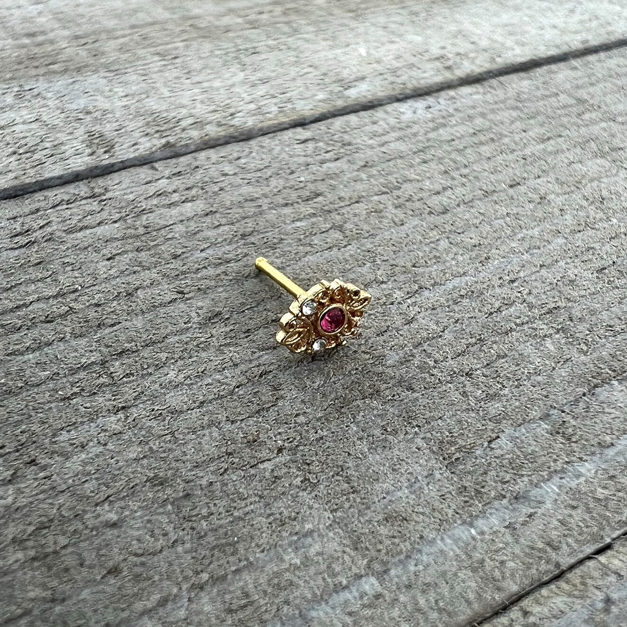 This 20 gauge nostril ring is sure to make you love its lacy look! It's made with a 6mm gold tone PVD over 316L surgical grade stainless steel straight post and features a lacy, openwork charm with looping details. The charm is set at the center with a large pink gem and is further embellished with a pair of small clear gems. This nose piercing ring is sure to turn you into a lace lover!