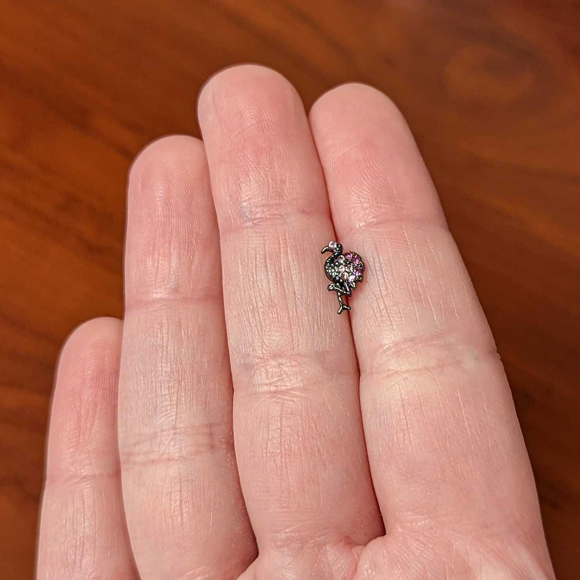 The flamingo on this 20 gauge nostril ring has style to spare! It's made with a 6mm durable 316L surgical grade stainless steel straight post. It features a flamingo charm standing in its iconic one-legged pose. It's set with hot pink gems and further embellished with a pink gem eye. Let this bold bird lend its style to your piercings with this fantastic flamingo nose piercing jewelry!