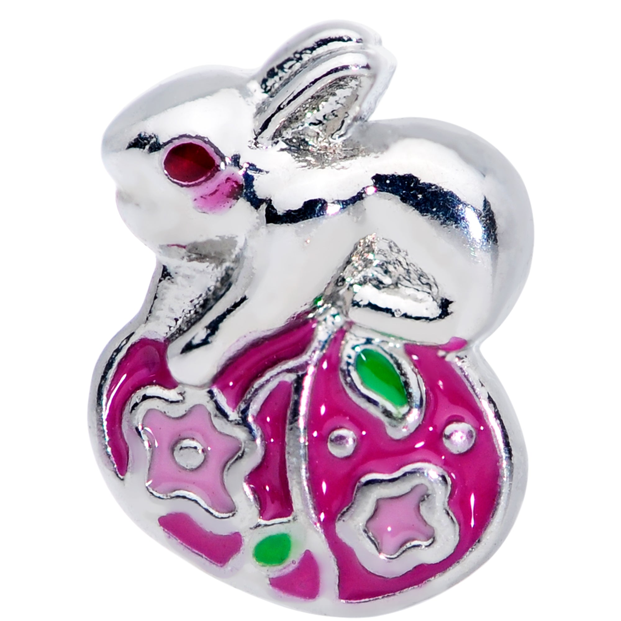 The Easter Bunny on this 20 gauge nostril ring may have taken on more than it can handle! It's made with a 6mm durable 316L surgical grade stainless steel straight post. It features an Easter Bunny charm with a pink gem eye. The bunny is sitting on an Easter Egg, which is inlaid in pink and features a floral pattern. The egg may be too big for the bunny to deliver but this nose ring is perfect for your nostril piercing!