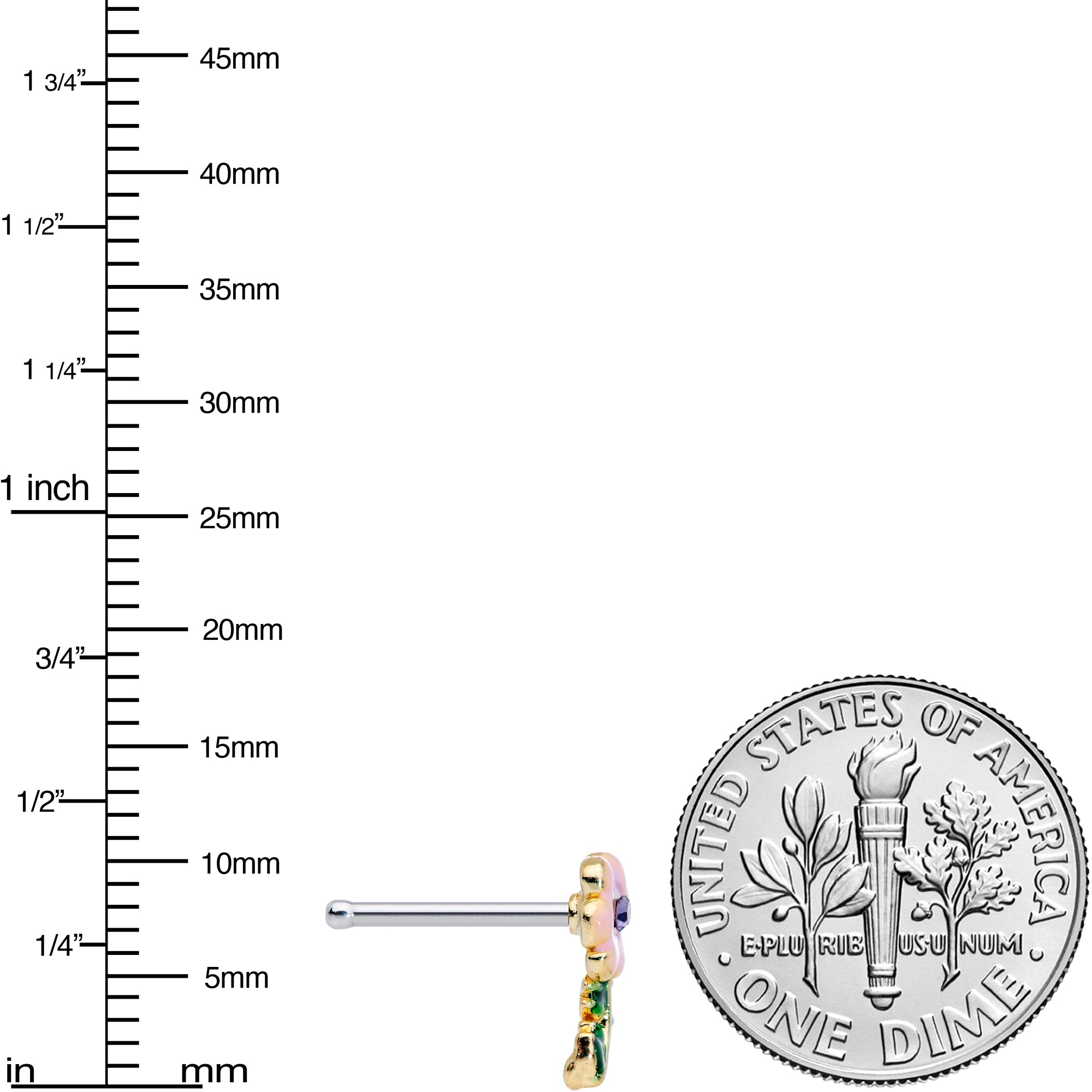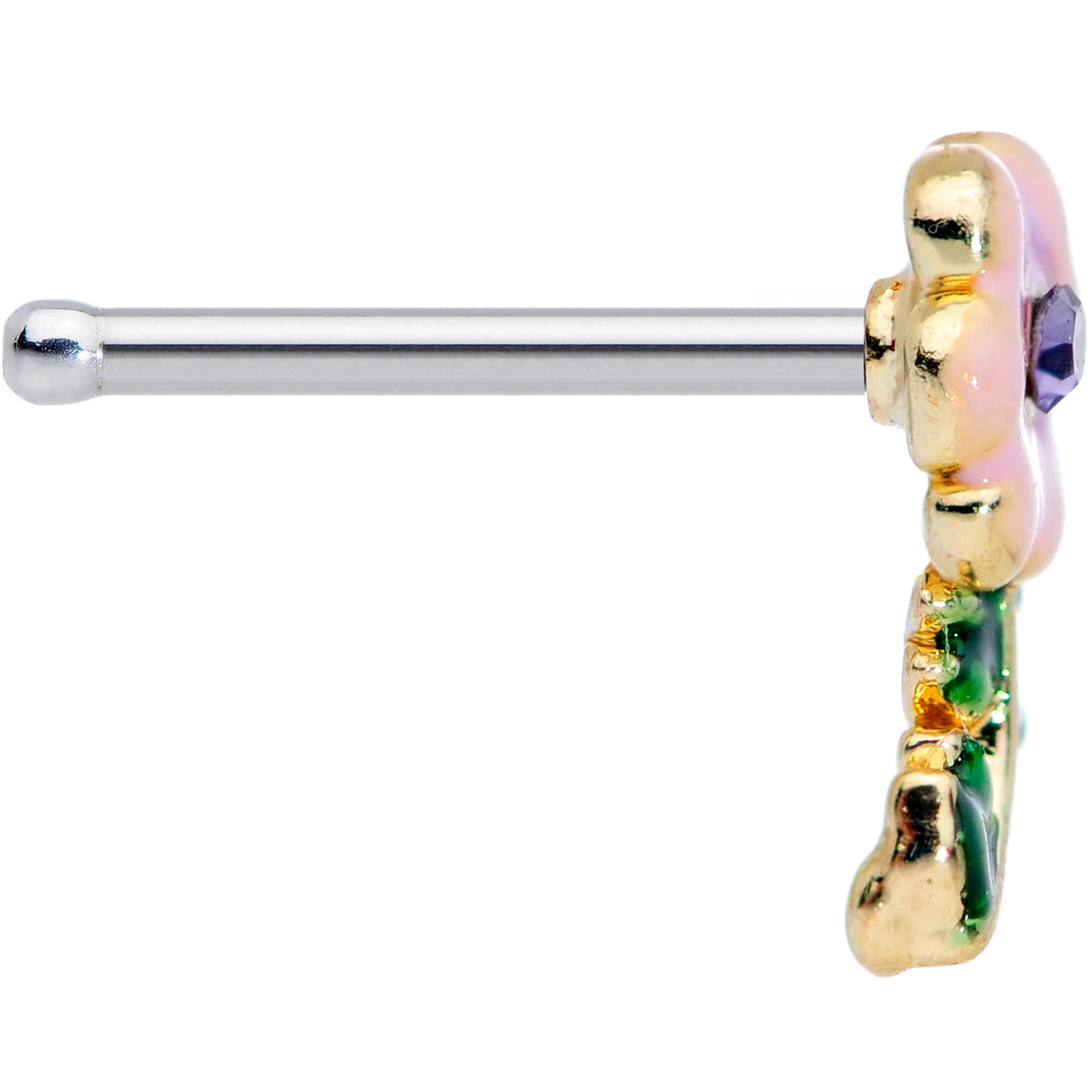 20 Gauge 1/4 Purple CZ Gem Pink Flower Leaves Nose Bone