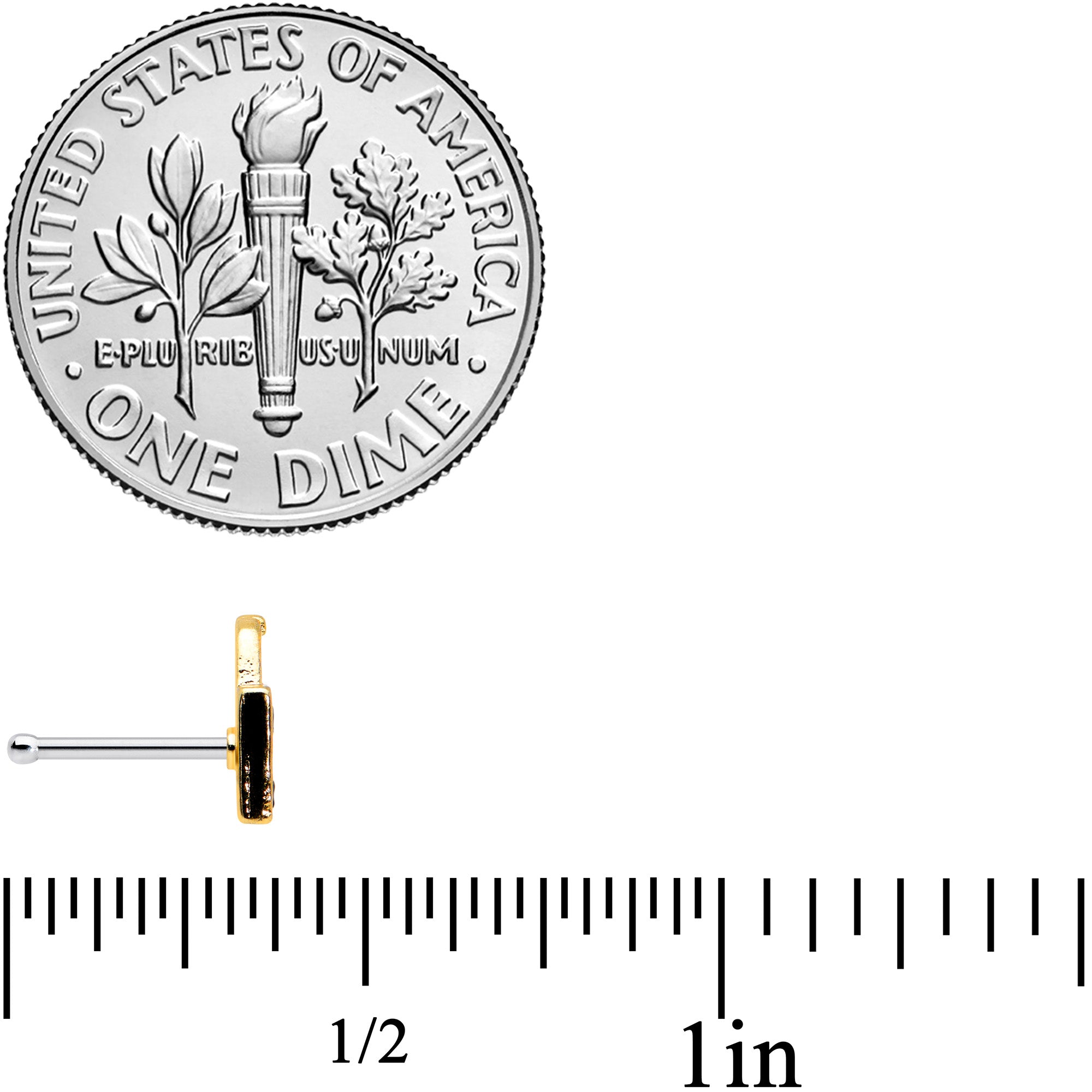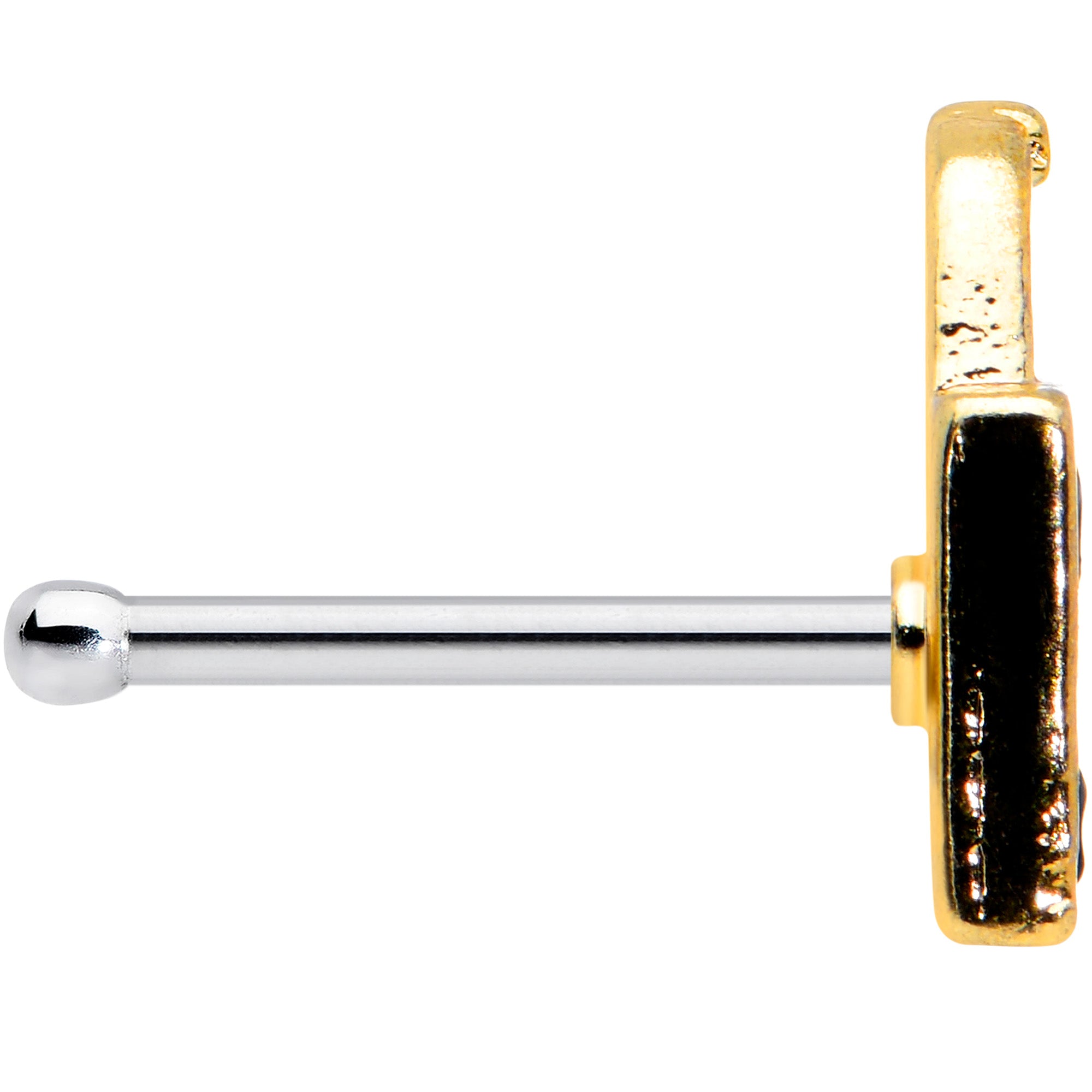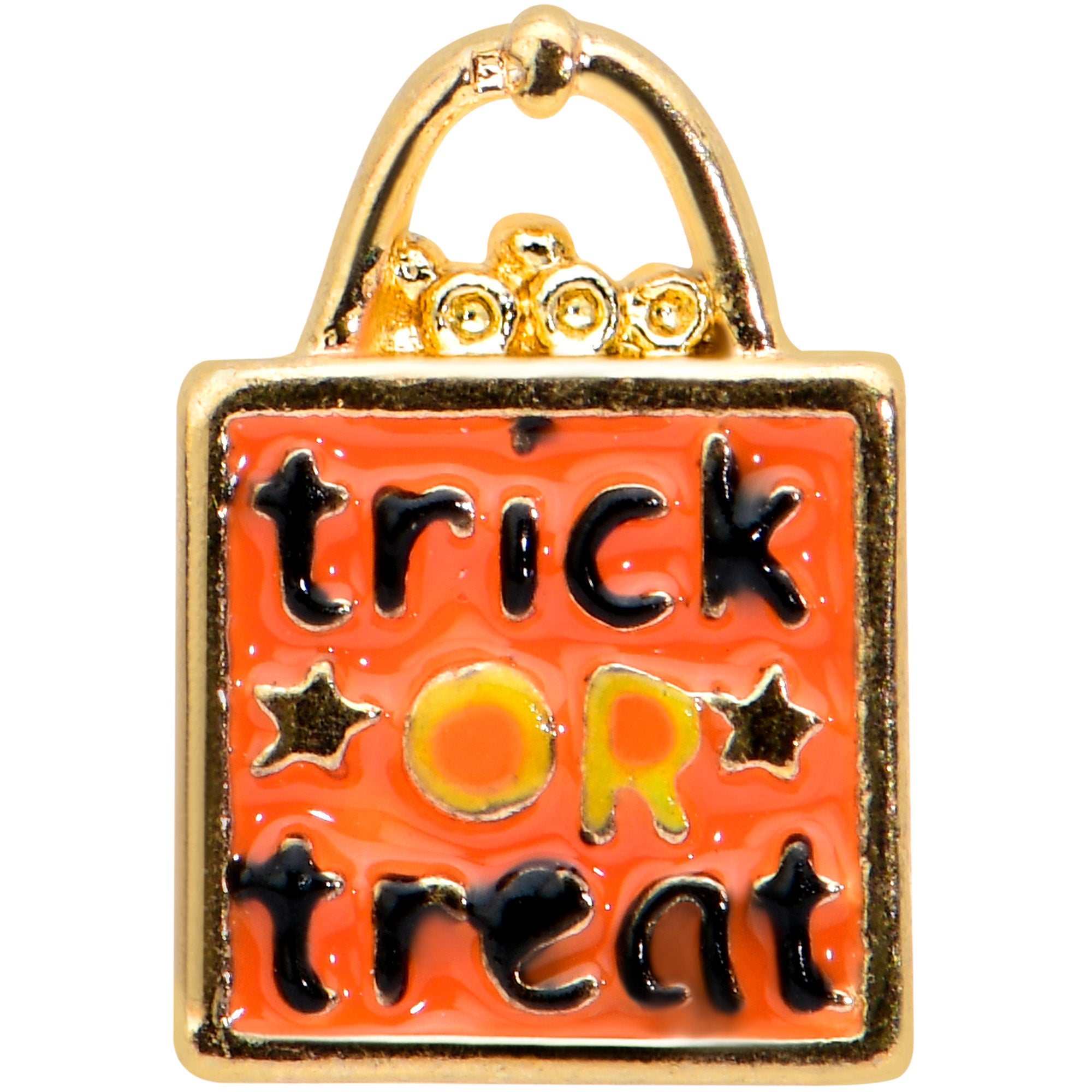 This Halloween, get all the treats when you're rocking this 20 gauge nostril ring! It's made with a 6mm durable 316L surgical grade stainless steel straight post. It features a trick or treat bag charm, inlaid in orange with black and yellow writing. Trick or treat with style with this Halloween nose piercing jewelry!