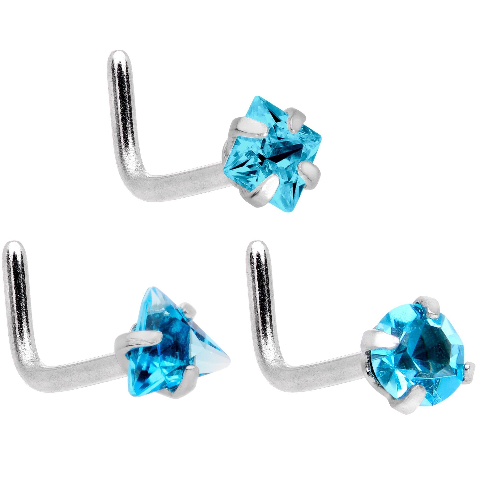 Don't ever worry about running out of jewelry again after you buy this set of 20 gauge nose piercings with perfectly pretty style! Made with 8mm durable 316L surgical grade stainless steel steel L-shaped posts, these nostril rings feature three 2.5mm aurora cubic zirconia gem ends and three 3mm aqua cubic zirconia gem ends. Sold as a set of six.