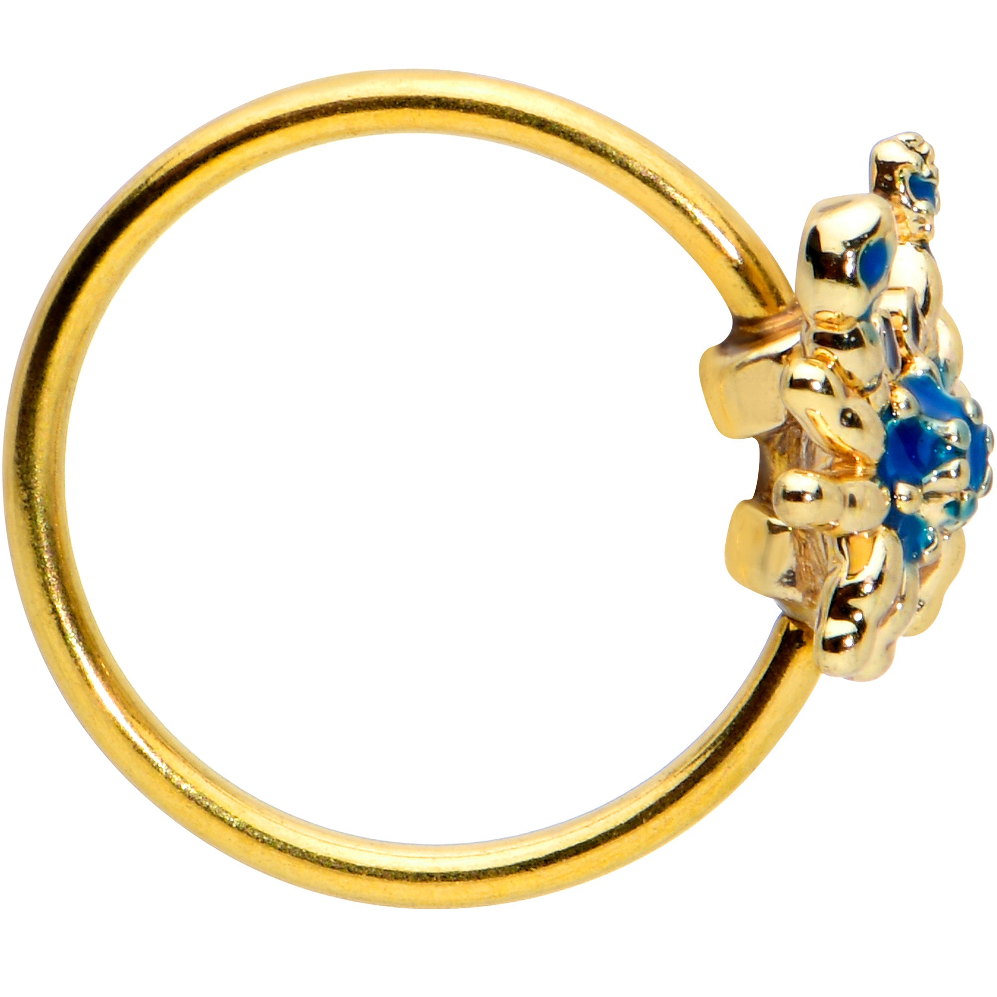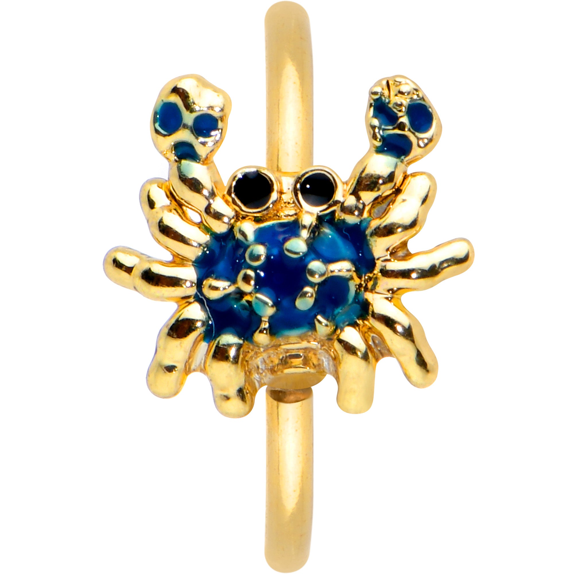 Catch a case of style when you're rocking this 20 gauge nostril ring! It's made with an 8mm gold tone PVD over 316L surgical grade stainless steel circular ring. It features a crab charm, inlaid in blue with black gem eyes. This colorful crustacean is further embellished with textured detailing for a look that's sure to please. This colorful crabby charmer is a perfect summer look for your nose piercing!