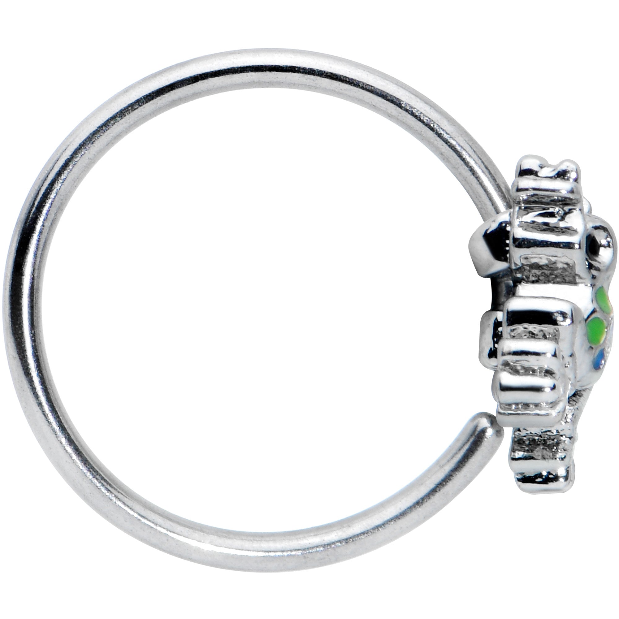 The frog on this 20 gauge nostril ring is adorably dotty! It's made with an 8mm durable 316L surgical grade stainless steel circular ring. It features a frog charm, with black gem eyes. The frog is embellished with blue and green polka dots for a look that's both whimsical and colorful. This frog is freaking fantastic!