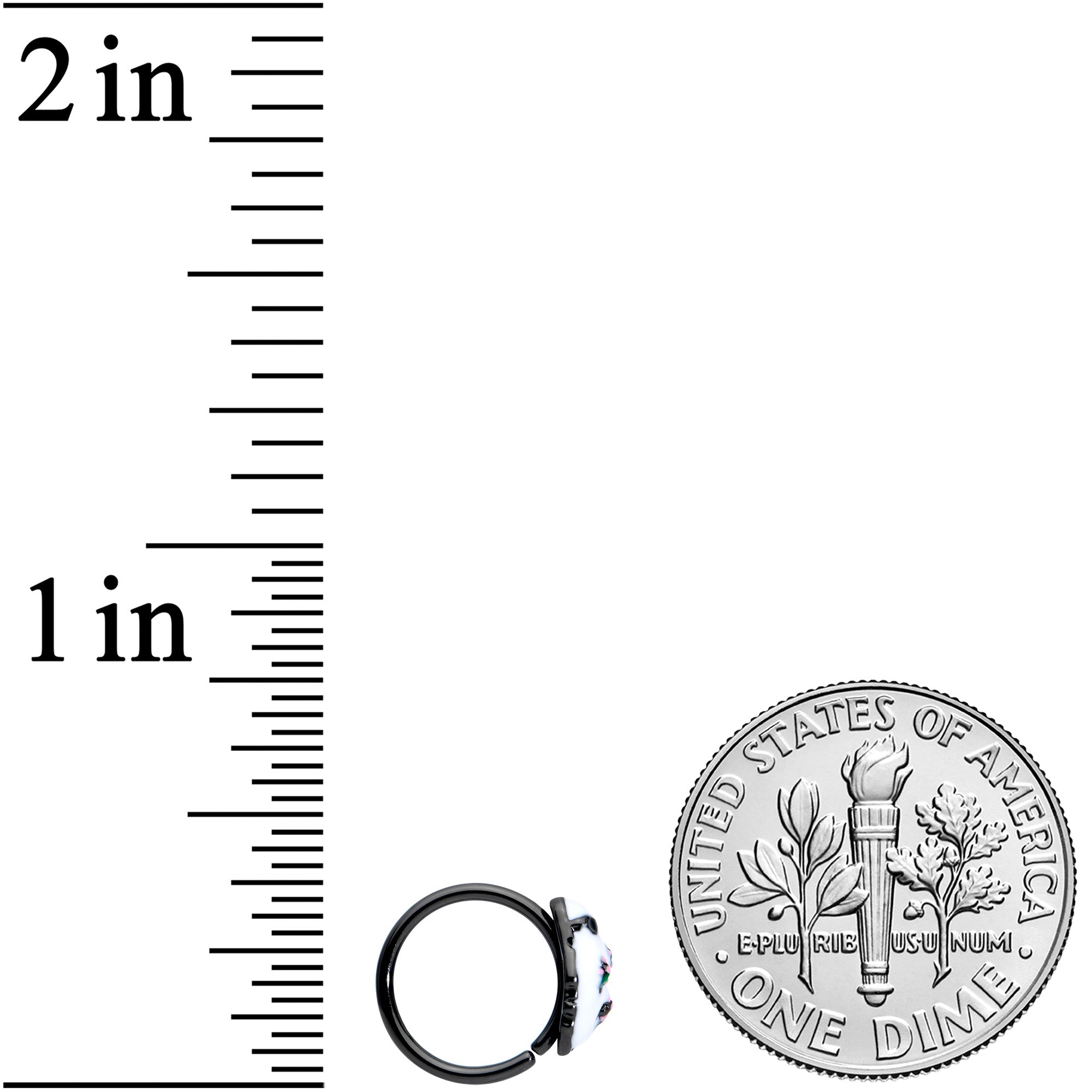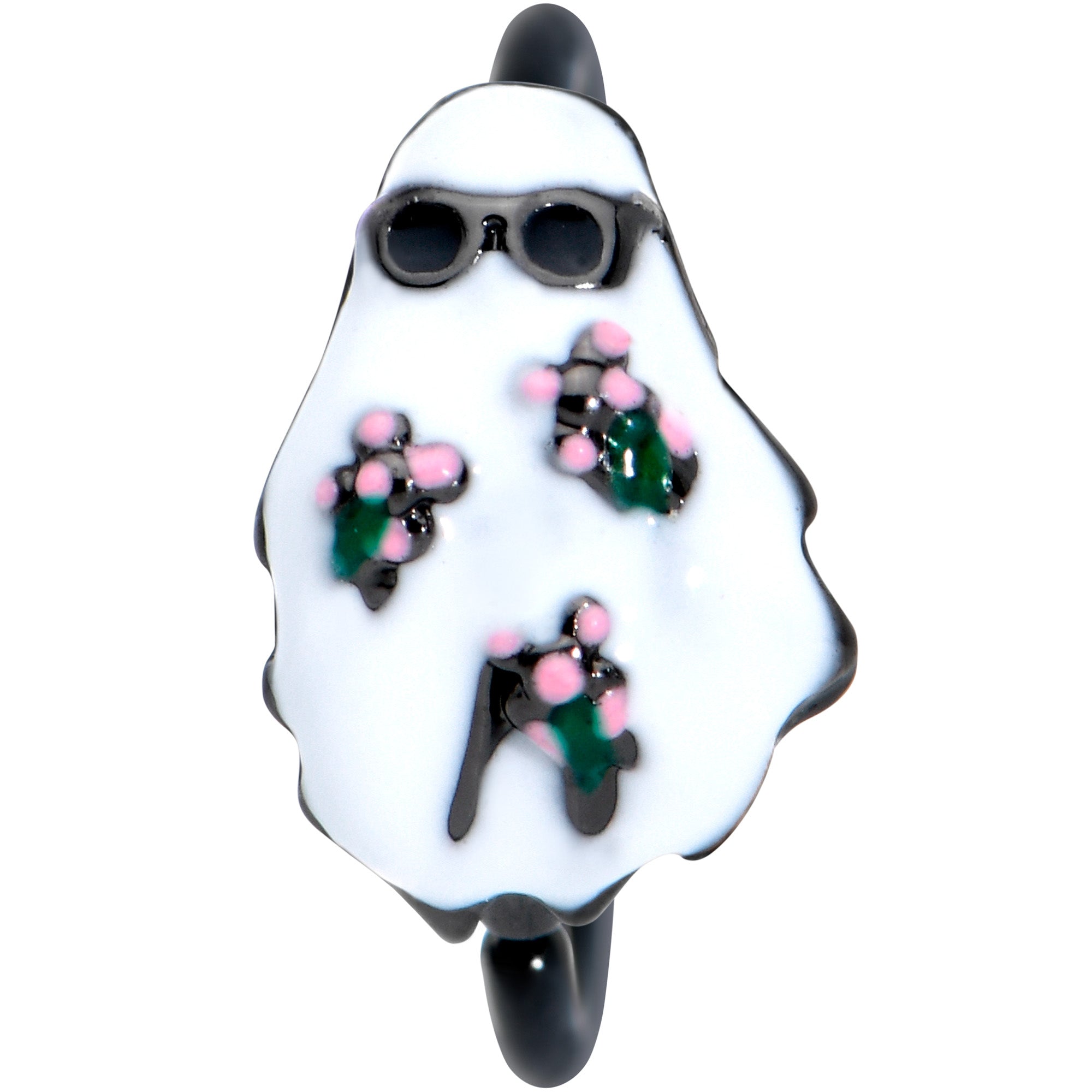 The ghost on this 20 gauge nostril ring is oozing with style! It's made with an 8mm black PVD over 316L surgical grade stainless steel circular ring. It features a ghost charm, wearing super-cool black shades. The ghost is also wearing a flowered sheet instead of a plain white one. You'll have the hippest Halloween ever with this stylish ghost nose piercing jewelry!