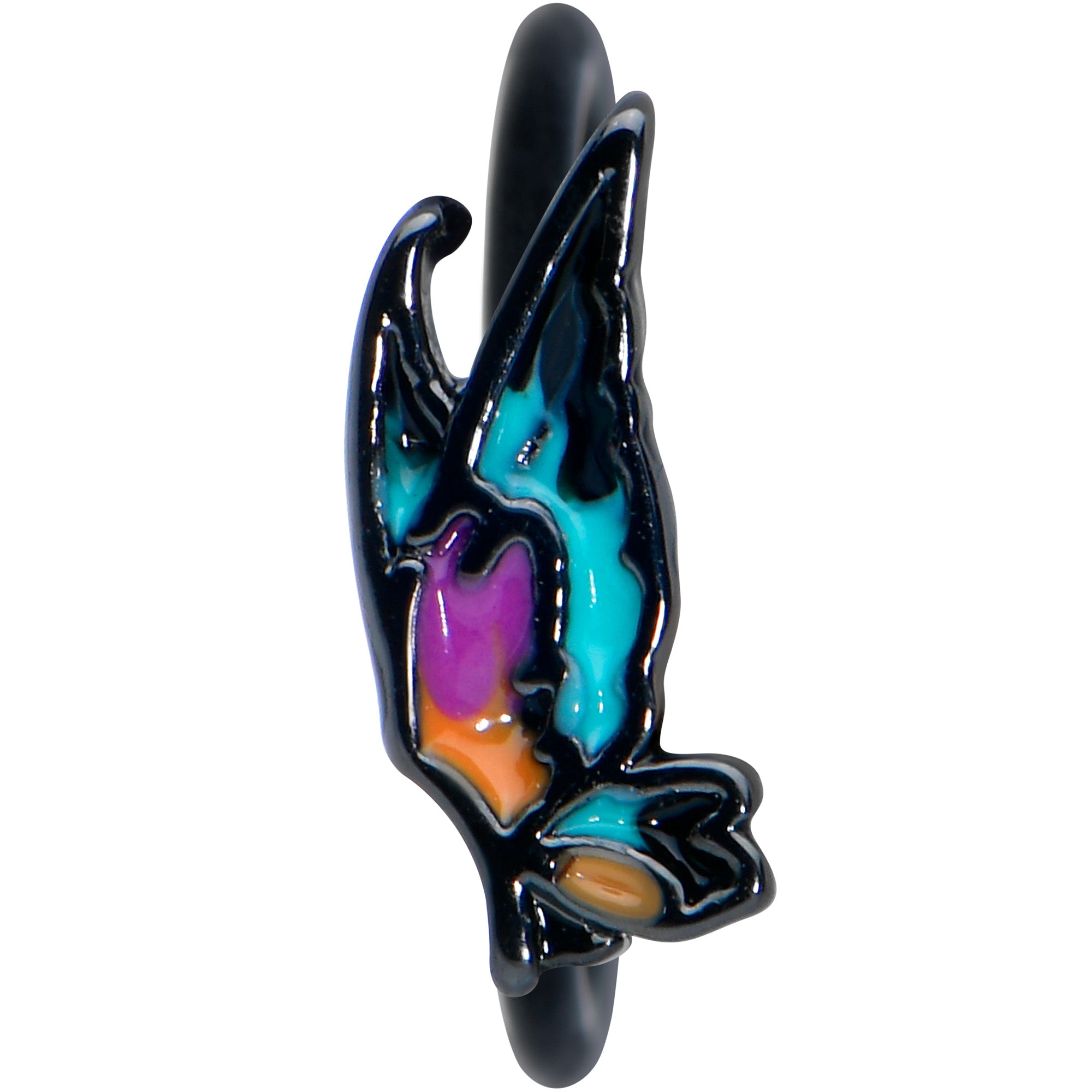 The butterfly on this 20 gauge nostril ring must have been kissed by the sunset to be so lovely! It's made with an 8mm black plated over 316L surgical grade stainless steel circular ring. It features a butterfly charm, with its wings inlaid in shades of blue, orange, and purple. It's further embellished with black detailing. Sail happily into the sunset when you're rocking this beautiful butterfly nose piercing jewelry!