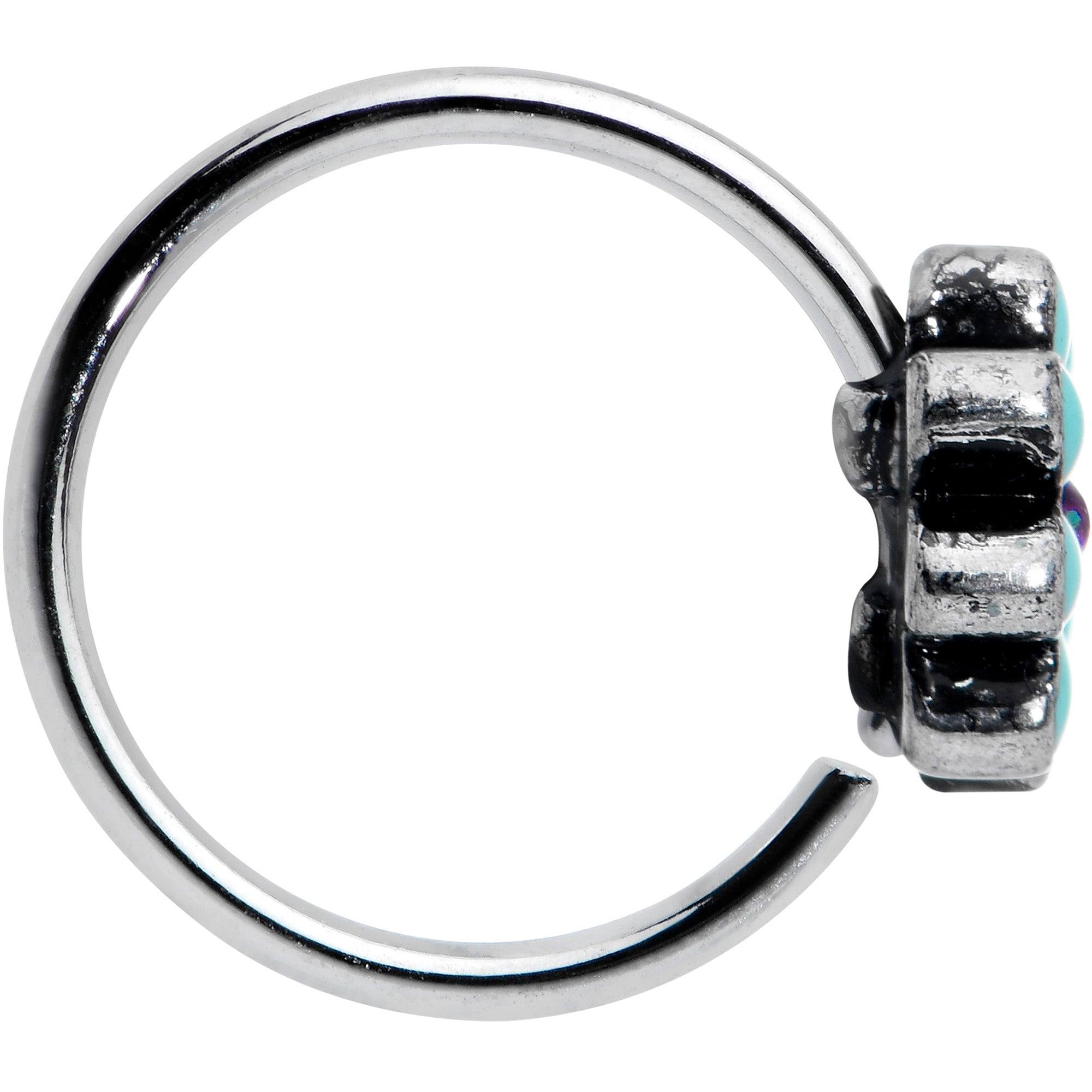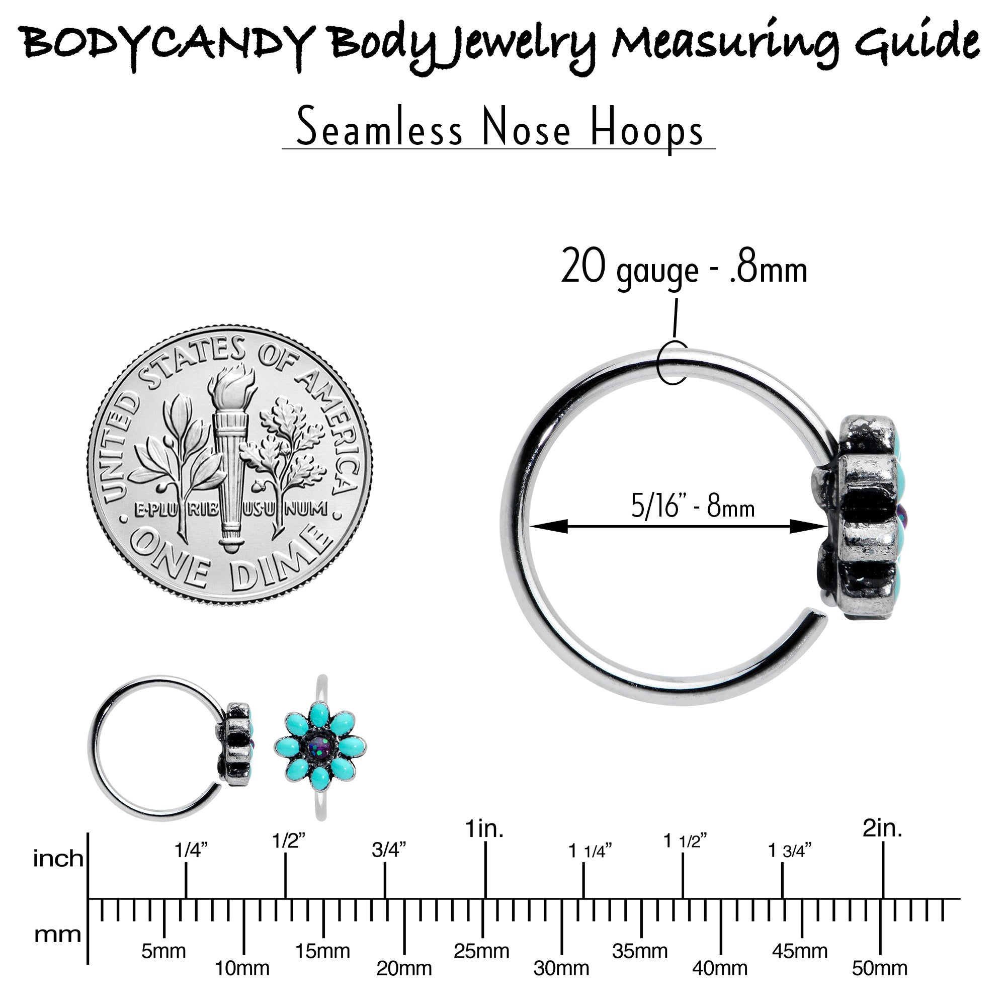 Add some flower power to your look with this 20 gauge nostril ring. It is made with an 8mm durable 316L surgical grade stainless steel circular ring. It features a flower charm, with the petals inlaid with teal orbs. It is further embellished with a blue gem center for an added touch of color. Let your nostril piercing blossom with this fabulously floral nose piercing ring.