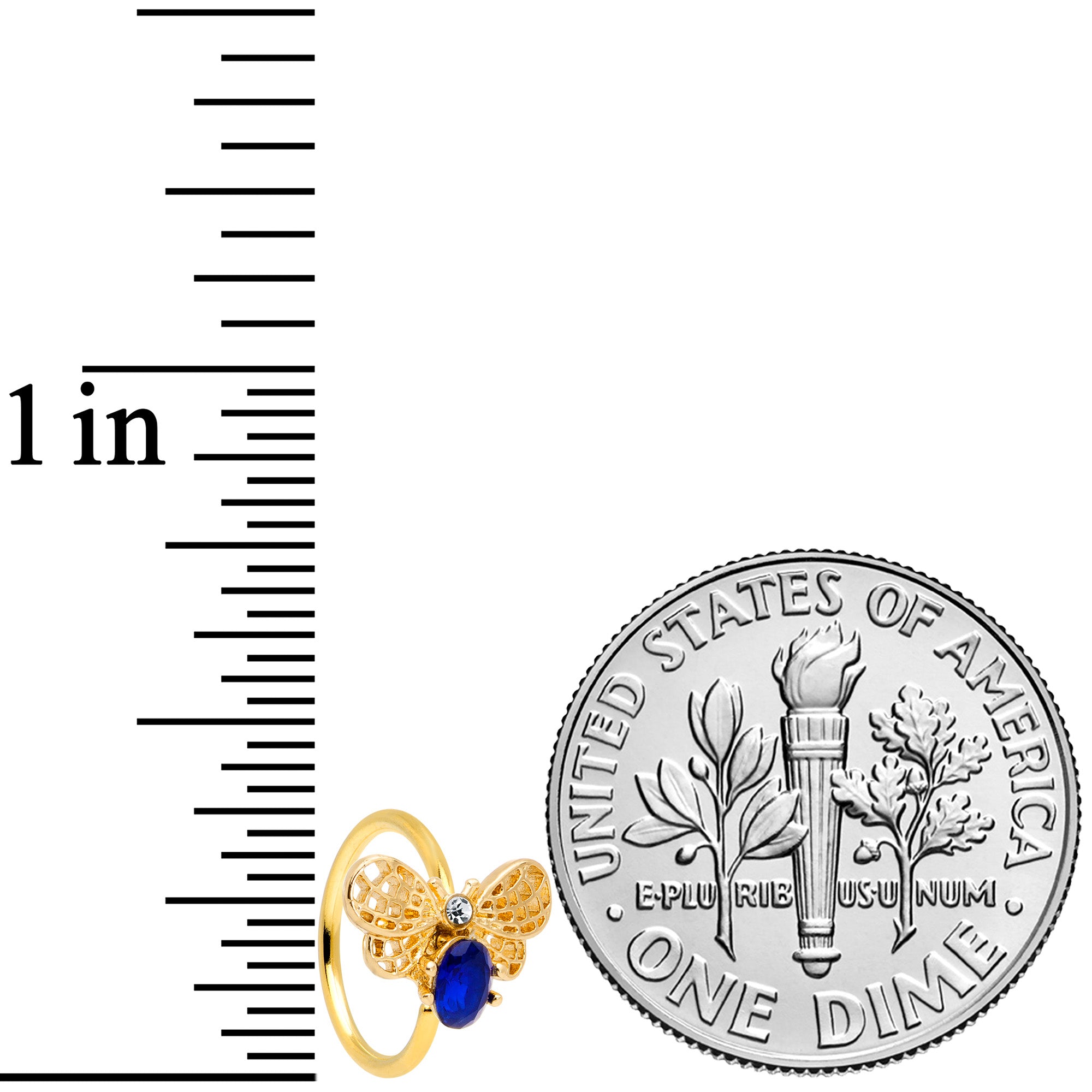 This 20 gauge nostril ring is sure to bee-utify your nose piercing! It's made with an 8mm gold tone PVD over 316L surgical grade stainless steel circular ring. It features a bee charm composed of a single large blue gem, with a tiny clear gem set at the head. The bee also features openwork wings and airy appearance that you are sure to love. This unconventional insect jewelry is sure to bee your favorite nose ring!