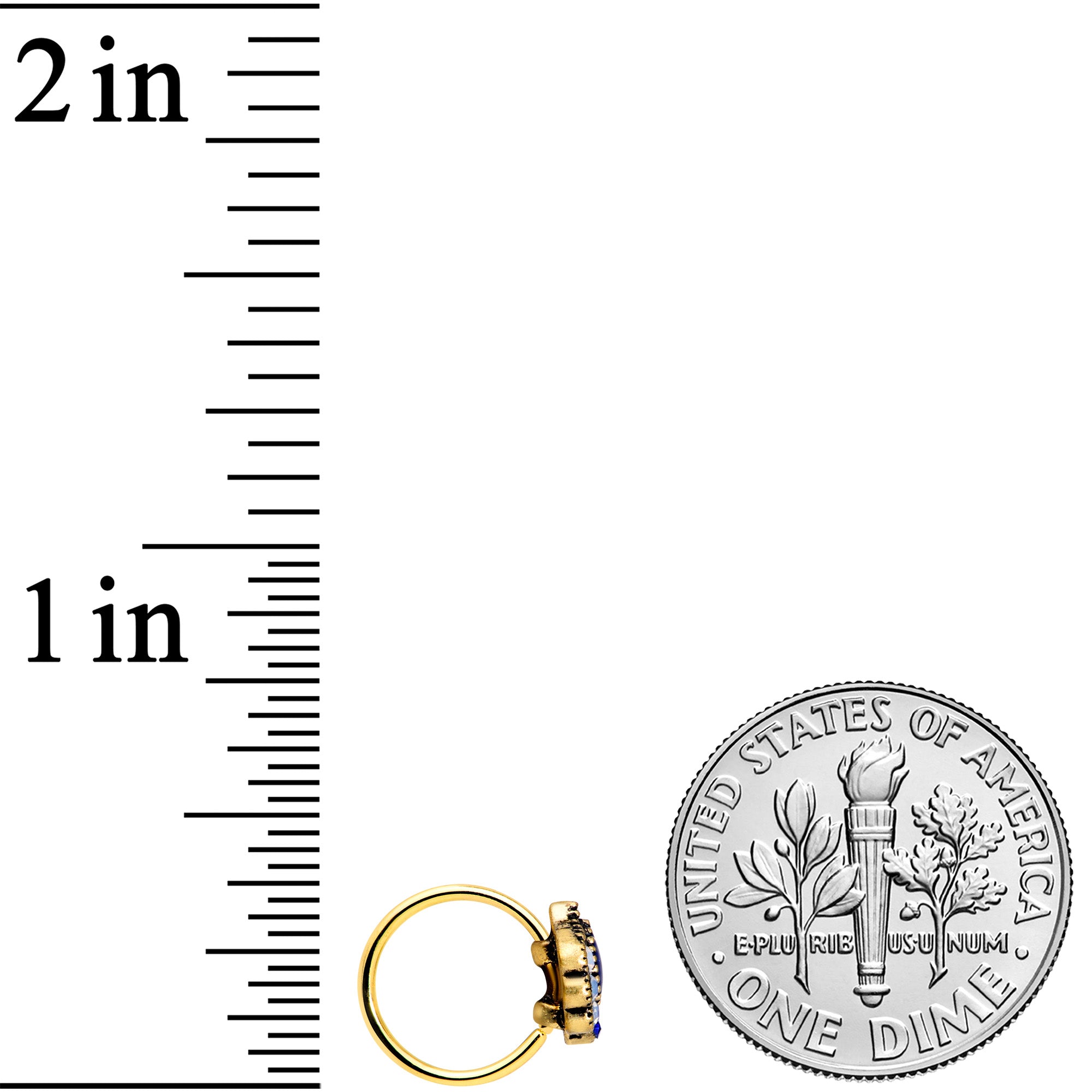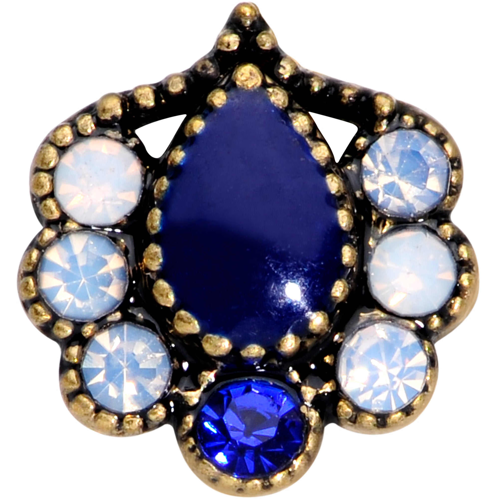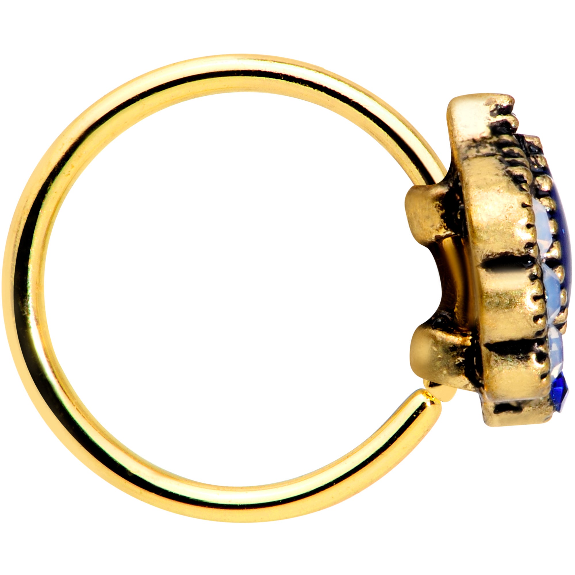 Get timeless style on very modern jewelry with this 20 gauge nostril ring! It's made with an 8mm gold tone PVD over 316L surgical grade stainless steel circular ring. It features a blue gem charm with one gem shaped like a teardrop and the other round. The charm is embellished with clear gems along the side for a look that's opulent but not overwhelming. Take your nose piercing back in time with this gorgeous, antique-inspired nostril jewelry!