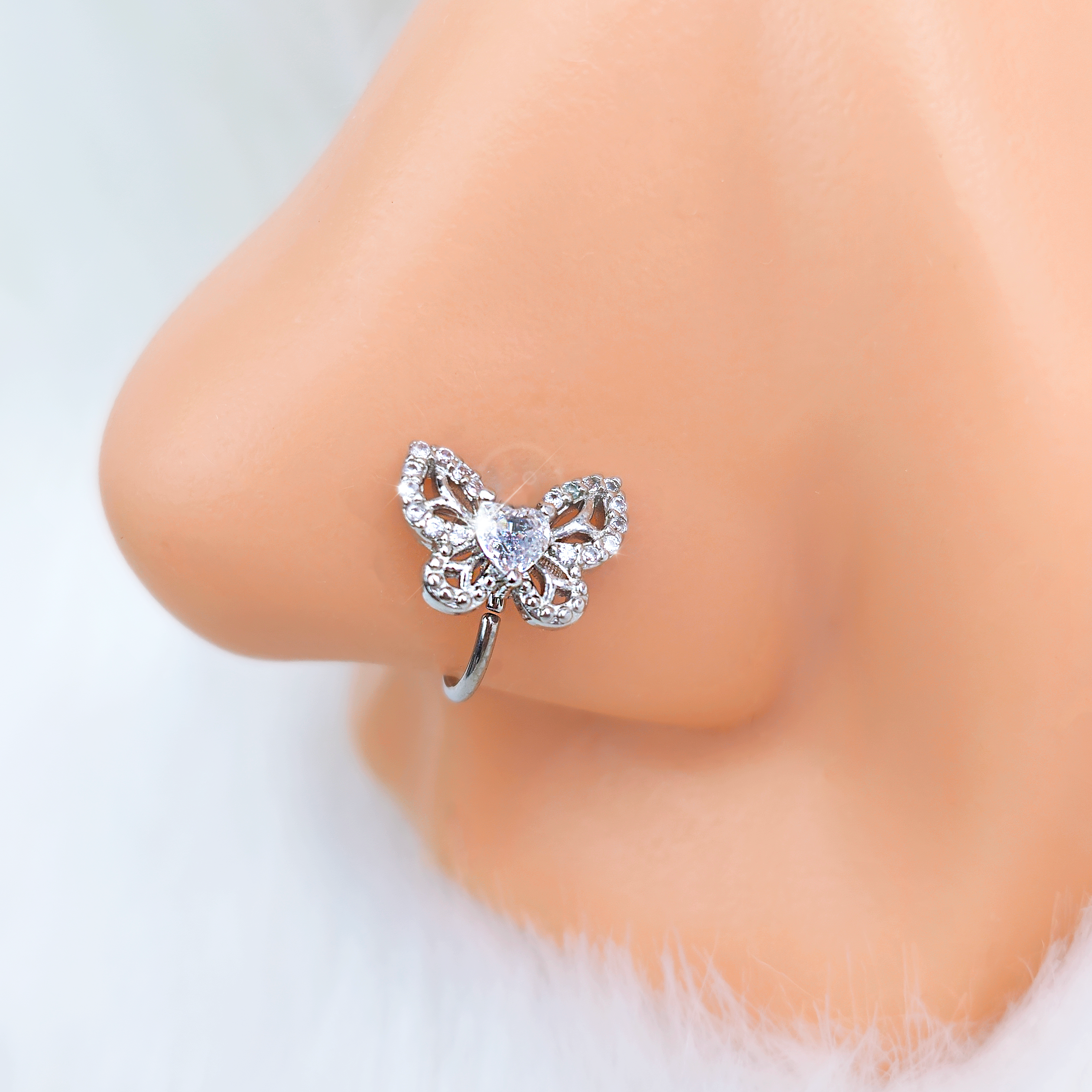 Add some butterfly whimsy to your look with this 20 gauge nostril ring. It is made with an 8mm durable 316L surgical grade stainless steel circular ring. It features a butterfly charm, embellished with textured detailing and clear cubic zirconia gems. It is set at the center with a clear cubic zirconia gem heart. Fill your look with whimsy with this lovely butterfly nose piercing jewelry.
