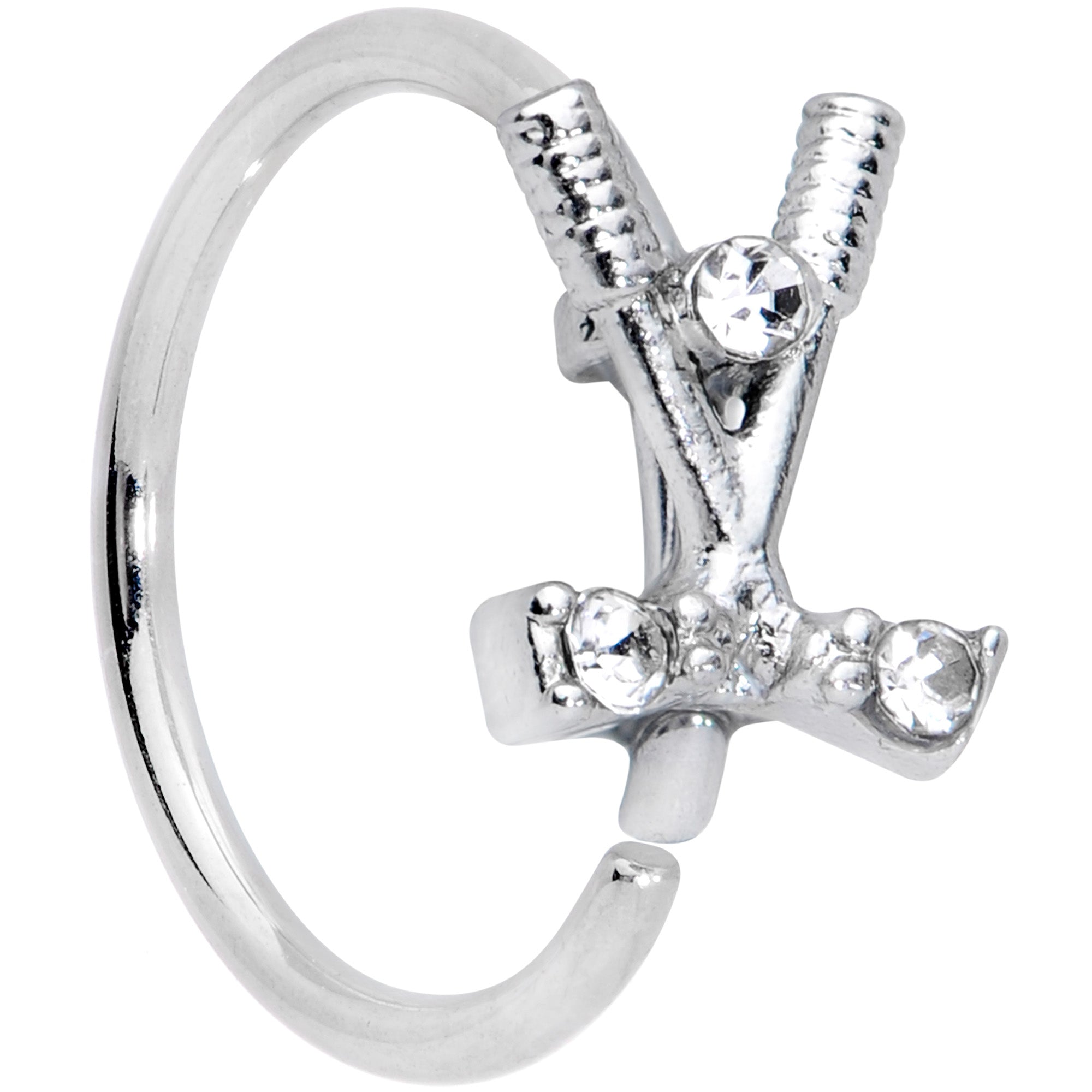 Fore! It's time to tee off with this 20 gauge golf-themed nostril jewelry! It's made with an 8mm durable 316L surgical grade stainless steel circular ring. It features a crossed golf clubs charm, the heads of each club set with clear cubic zirconia gems. Perched between them is a small round clear cubic zirconia gem, representing a ball. So grab your cleats and your golf bag - with this body jewelry it's always tee time!