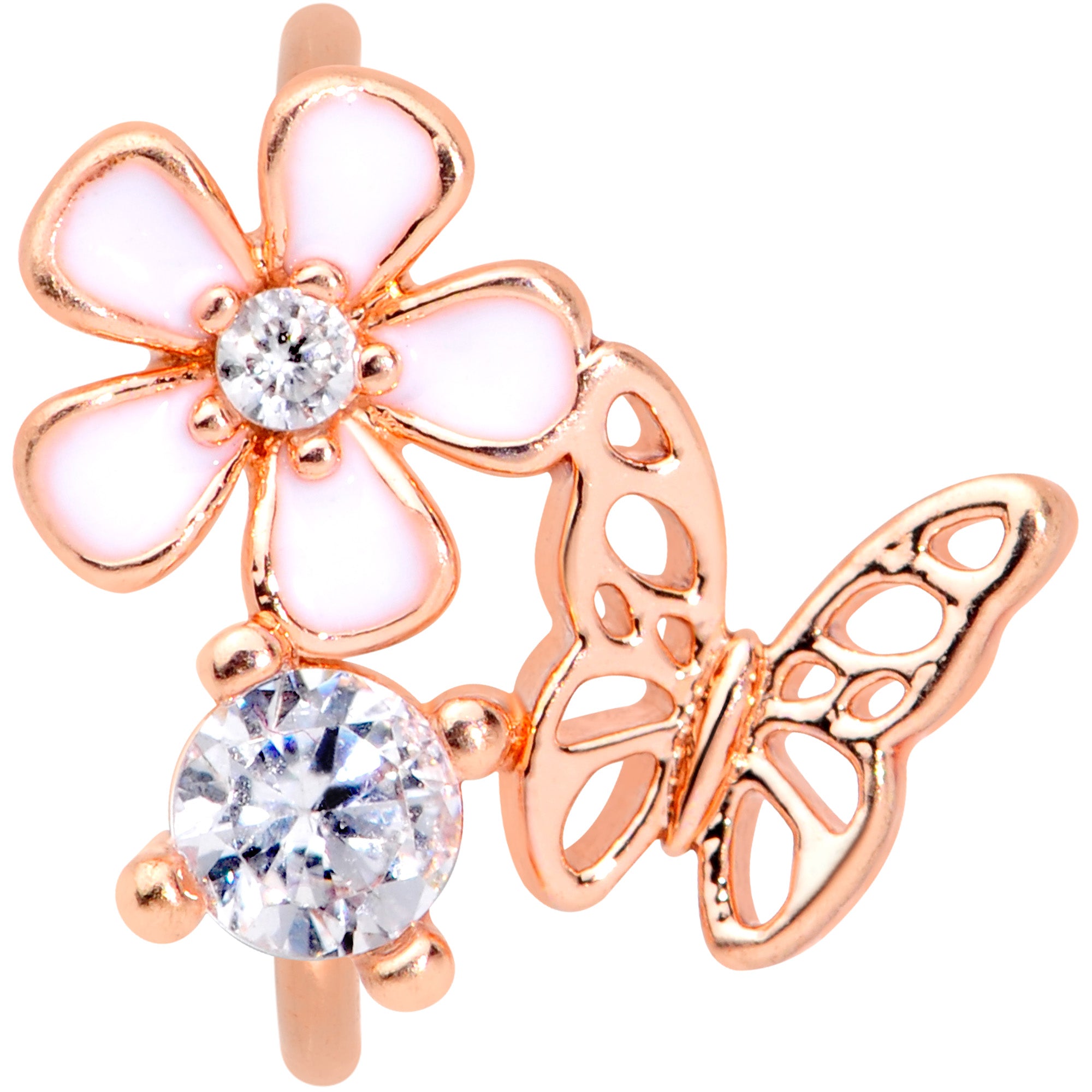 20G 5/16 Clear CZ Gem Rose Gold Tone Butterfly Flower Nose Hoop