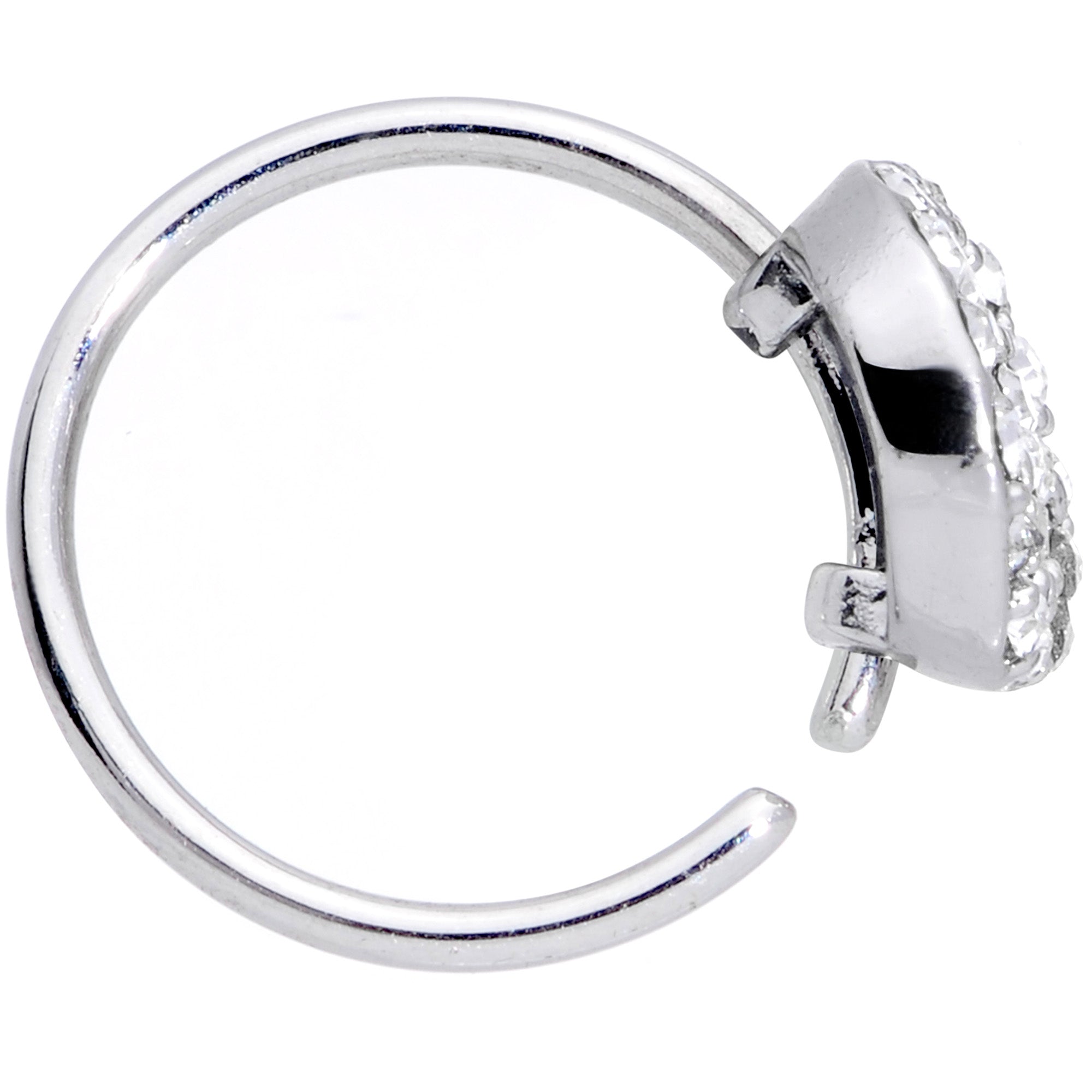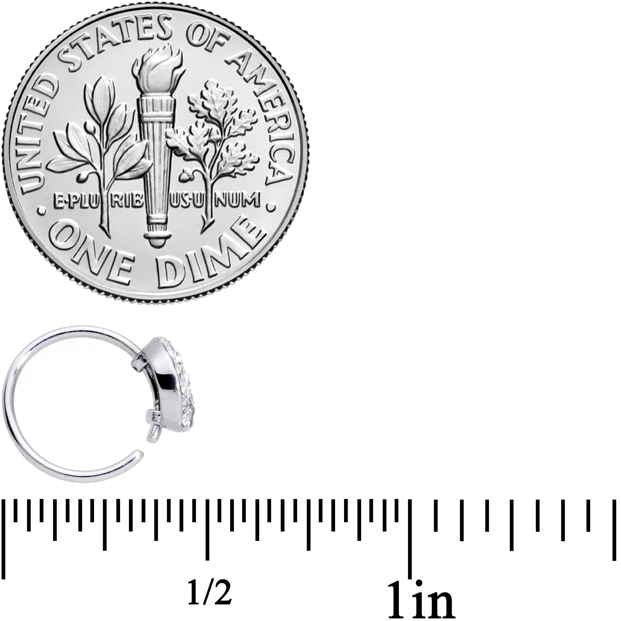 Why make war when peace looks this good? This 20 gauge nose ring is made with an 8mm durable 316L surgical grade stainless steel circular ring and features a peace sign charm paved in clear gems for a look that mixes politics with panache. And because peace is contagious, this peace sign body jewelry works well in some ear lobe piercings as well. To insert, simply twist open, insert, and gently twist shut again. This nostril jewelry is sure to make you a happy hippie!