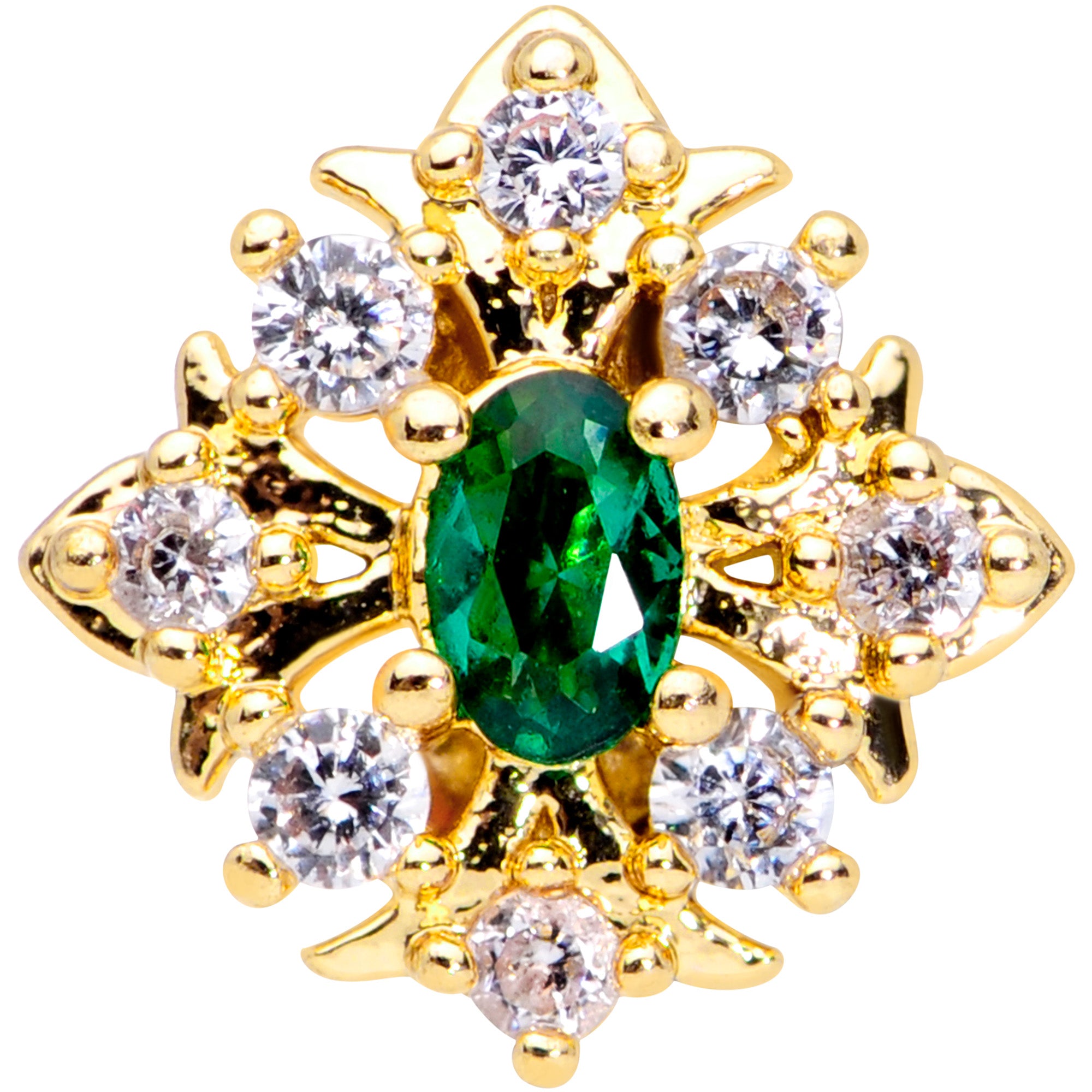 Take your nose piercing back in time with this antique-inspired 20 gauge nostril jewelry! It's made with an 8mm gold tone PVD over 316L surgical grade stainless steel circular ring. It features a large, oval green gem charm, set in a stylized rhombus that's embellished with clear gems for an elegantly retro appearance. Give an antique-inspired look to a modern piercing with this Art Deco styled nose jewelry!