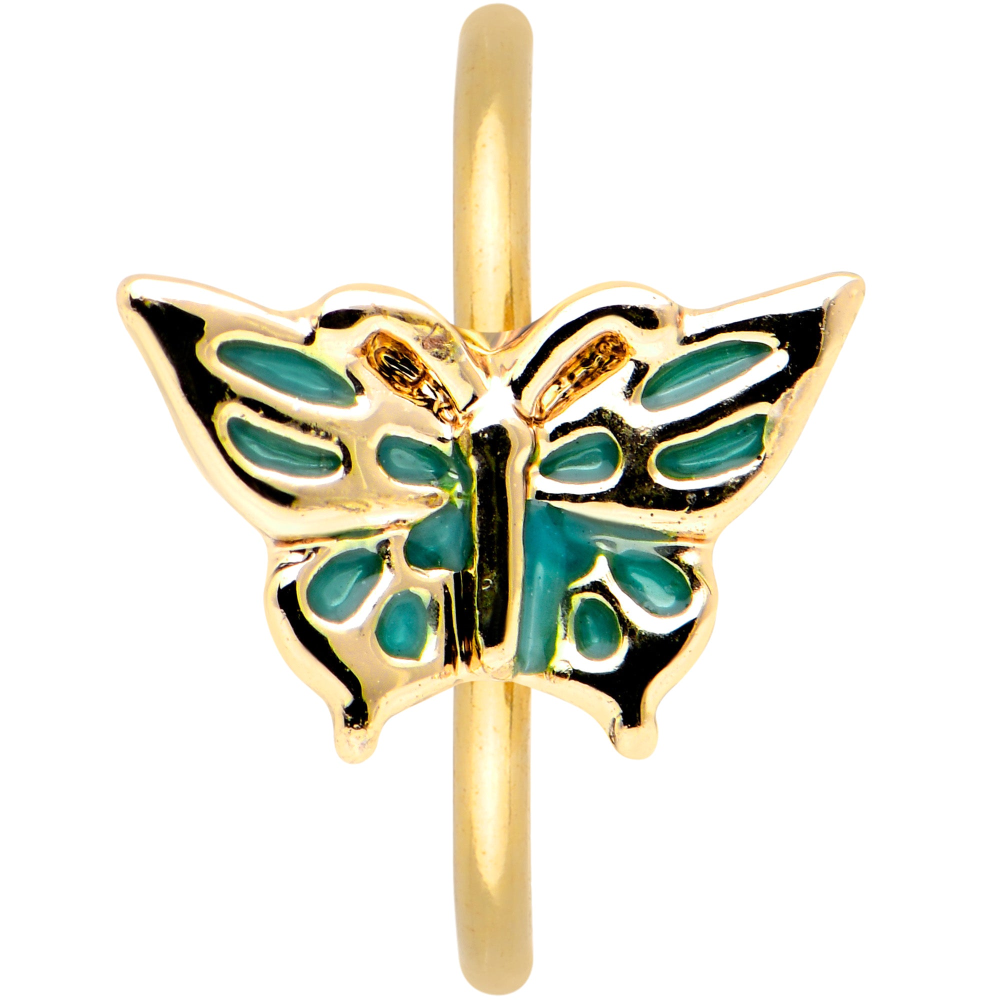 Go green and look beautiful doing it with this 20 gauge nostril ring! It's made with an 8mm gold tone PVD over 316L surgical grade stainless steel circular ring. It features a butterfly charm with openwork designs on its wings. Underneath, green inlay adds color contrast and eye-catching detail to really set this piece apart from the crowd! Lift up your nose piercing from the ordinary with this beautiful butterfly nostril piercing jewelry!