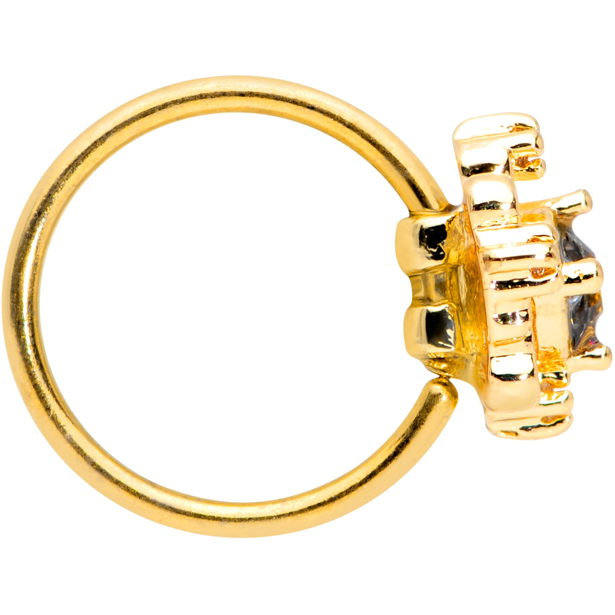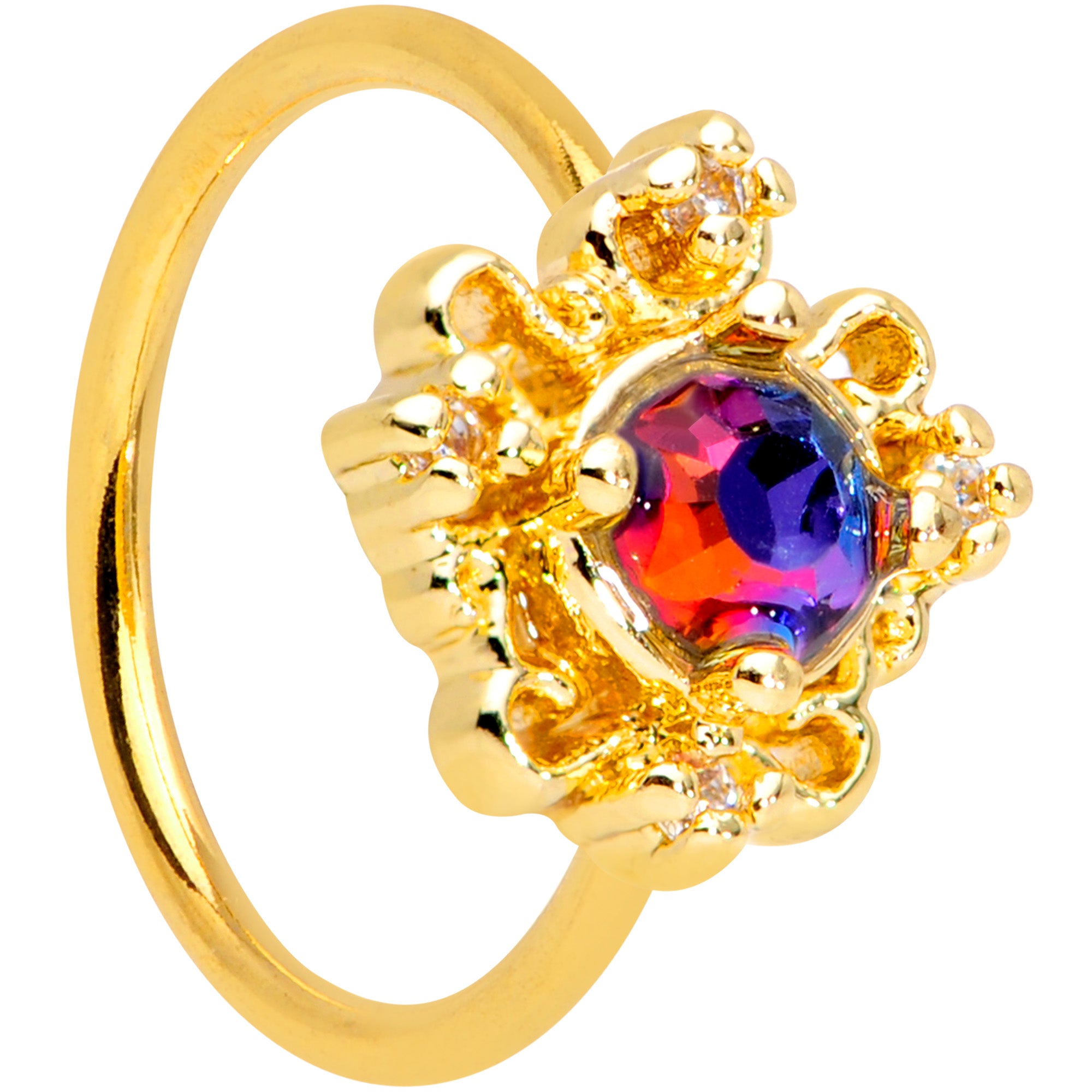If this 20 gauge nostril ring could talk, it would tell you that you are the loveliest of lovelies when you're wearing it! It's made with an 8mm gold tone PVD over 316L surgical grade stainless steel circular ring. It features a purple tourmaline charm set in an openwork circle. You'll be feeling gorgeous and ready to rule with this fetching filigree nose piercing ring!