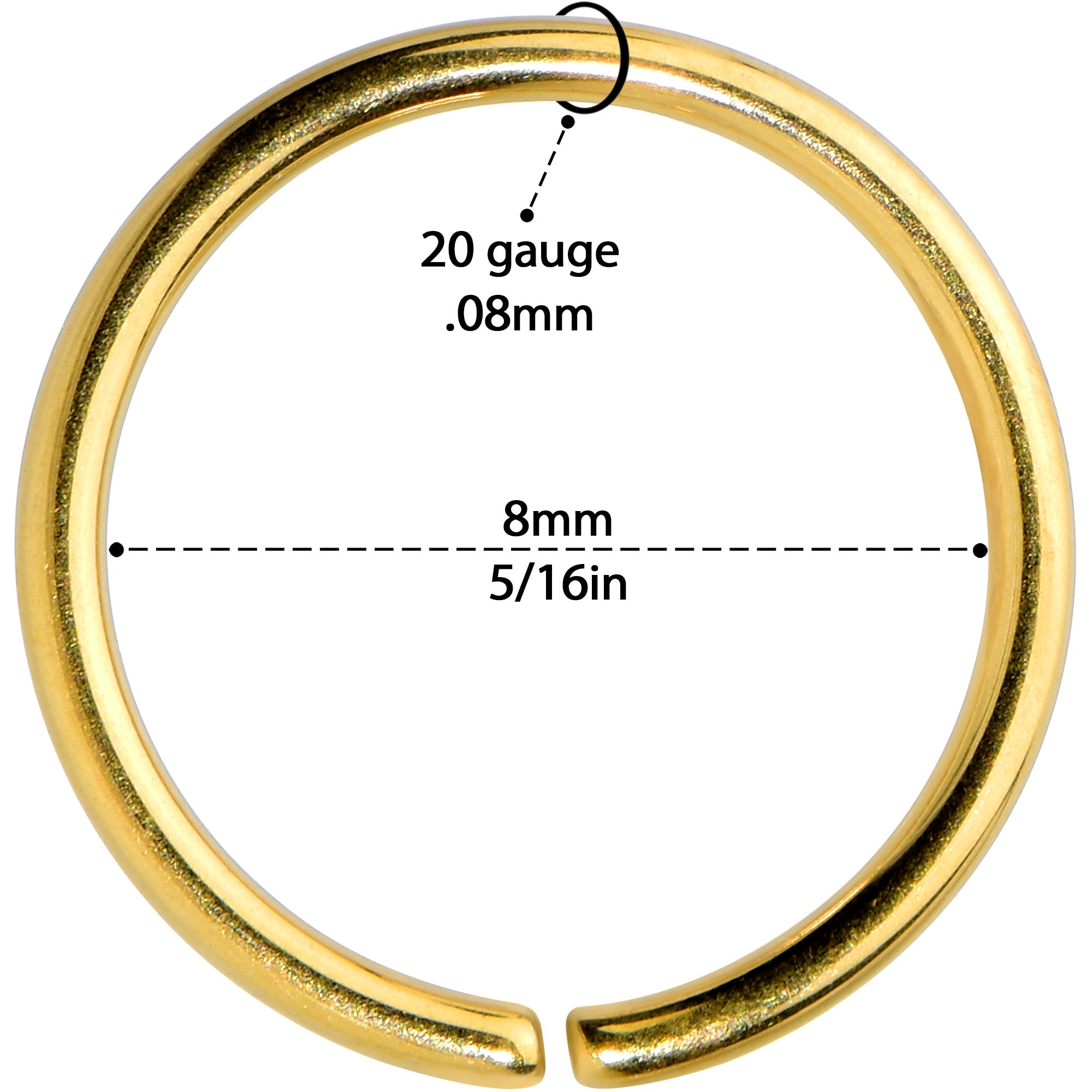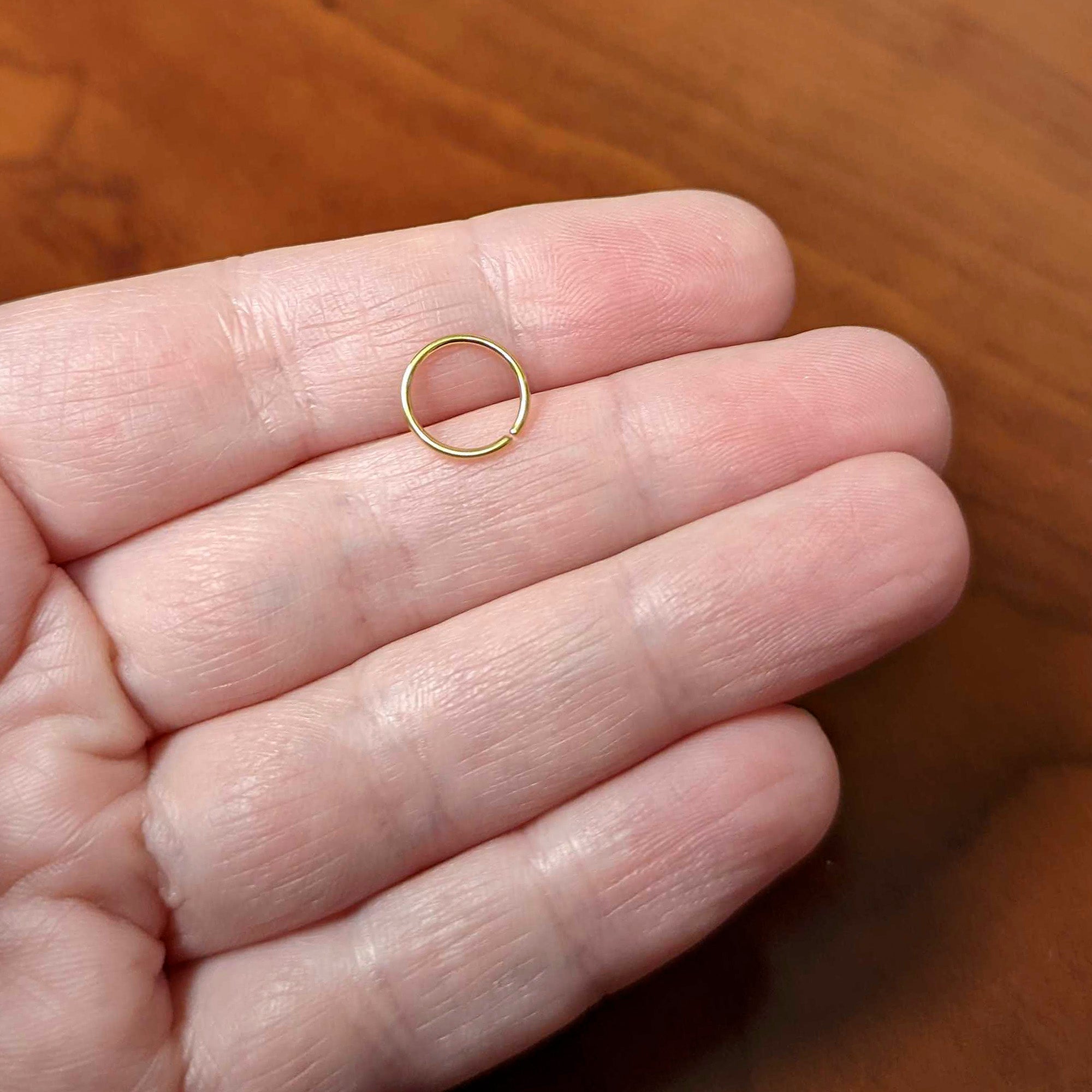 Sometimes we all need closure....sometimes we just need some awesome jewelry like this 20 gauge nostril ring! It's made with an 8mm gold tone PVD over solid grade 23 implant grade titanium circular ring. It features durable materials as well as simple style that never goes out of fashion. It also features rounded ends to make insertion and removal super comfortable. This hoop ring is super easy to insert and remove - simply twist the ring open, insert, and then twist gently shut again. Put some quality elegance in your nose piercing with this understated nostril piercing ring! This bendable titanium hoop can be used for multiple piercings including lip ring, ear piericngs and nose hoop.