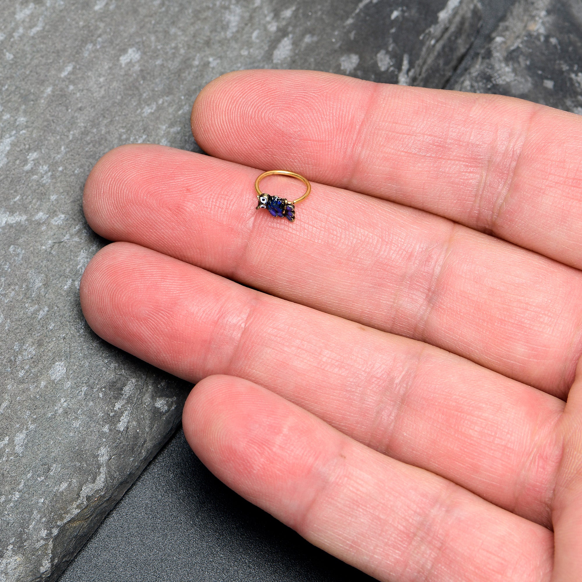 This 20 gauge nostril ring is sure to make you want to hoot. It's made with an 8mm gold tone PVD over 316L surgical grade stainless steel circular ring. It features an owl charm, with a wide eyed expression that's utterly endearing. It also features textured embellishment and blue embellishment to make each detail really pop. If you're all about owls, this avian nose piercing jewelry is sure to make your heart take flight.