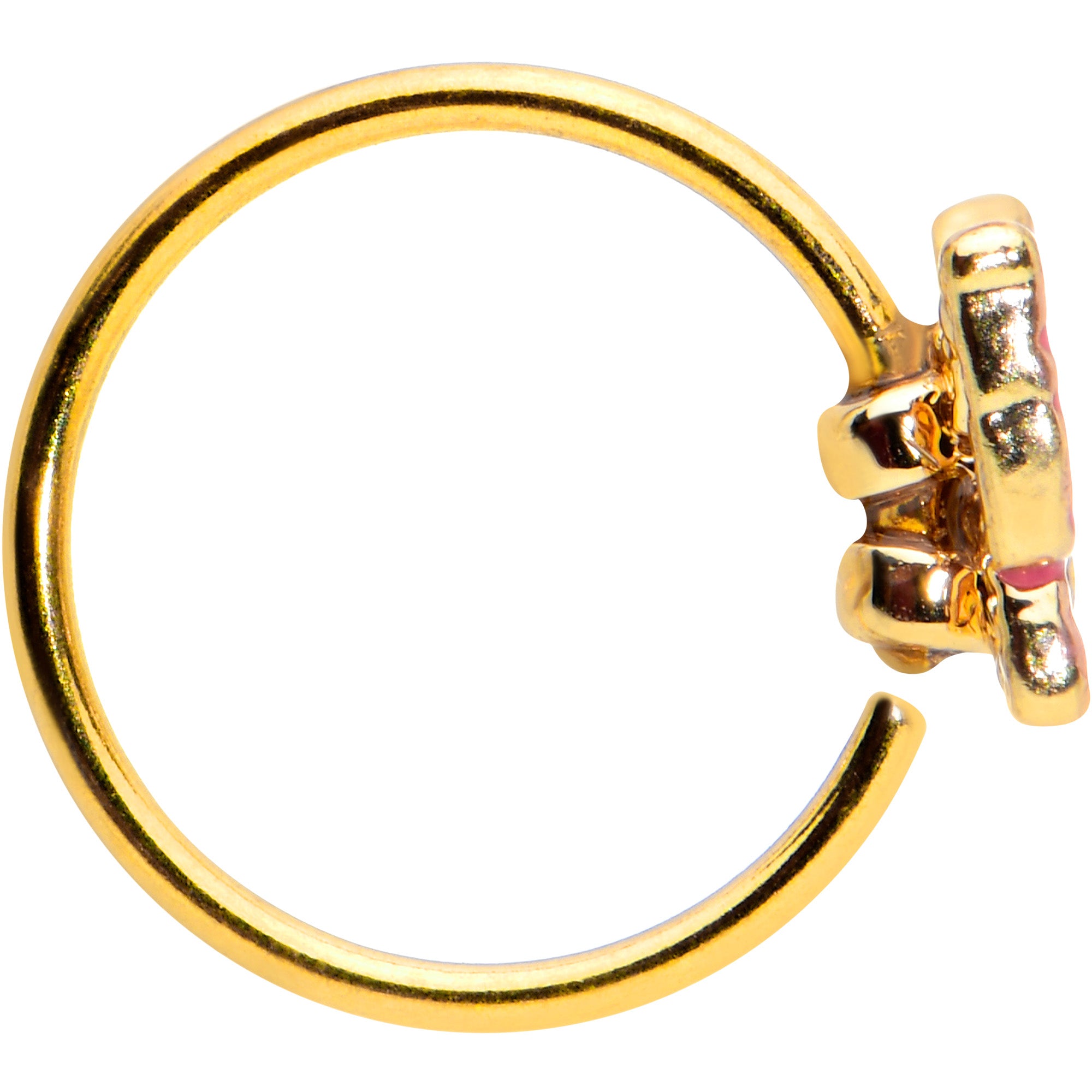 Keep it simple while keeping it stylish with this 20 gauge nostril ring! It's made with an 8mm gold tone PVD over 316L surgical grade stainless steel circular ring. It features a butterfly charm, done in an openwork style. The butterfly features pink embellishments for added color and style. This nose piercing ring proves that simple never has to mean boring!