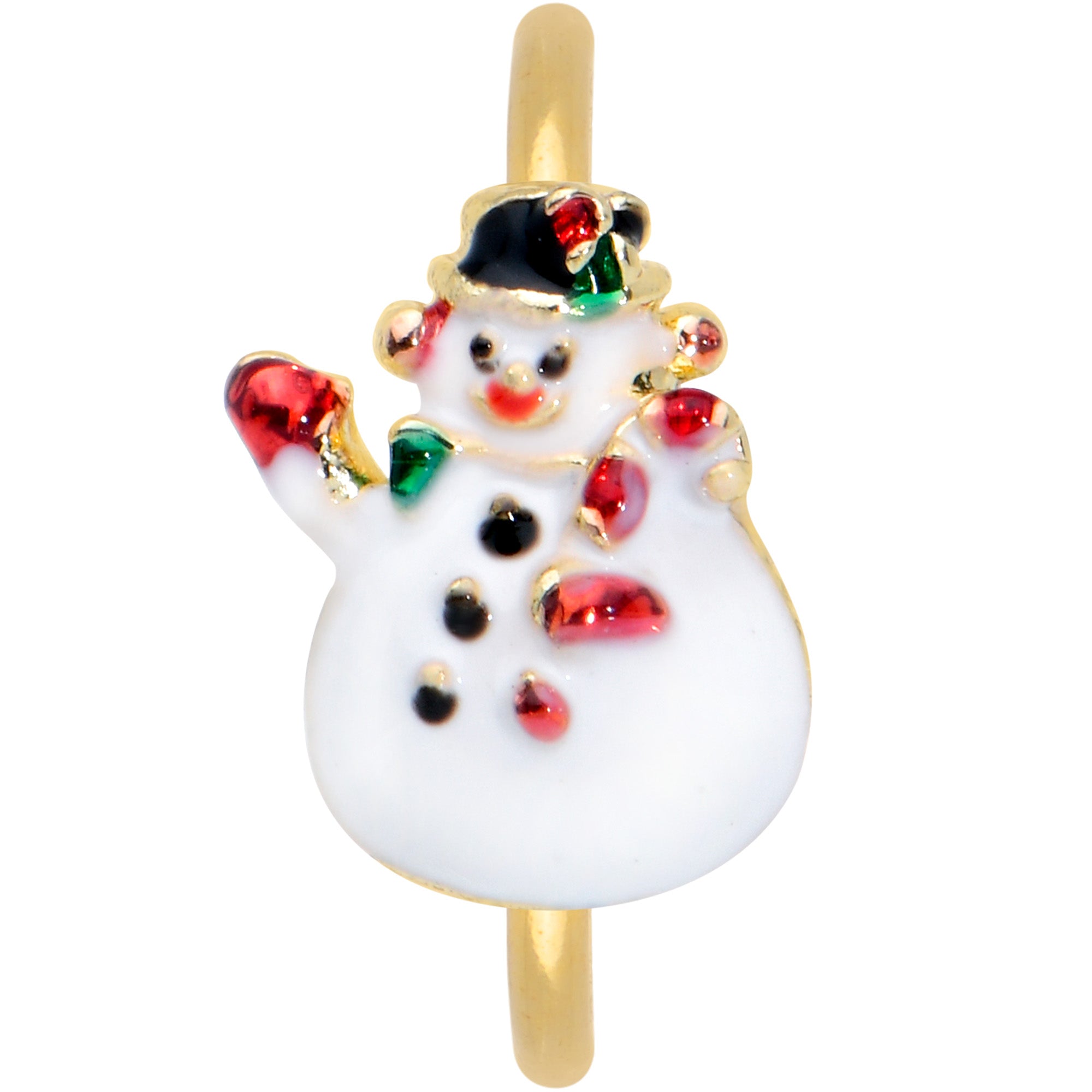 Give a hearty hello to everyone you see with this 20 gauge nostril ring! It's made with an 8mm gold tone PVD over 316L surgical grade stainless steel circular ring and features a white snowman charm. The snowman is embellished with colorful red mittens and green scarf, as well as a traditional black hat. Say hello to winter with this fabulous, friendly snowman nose jewelry!