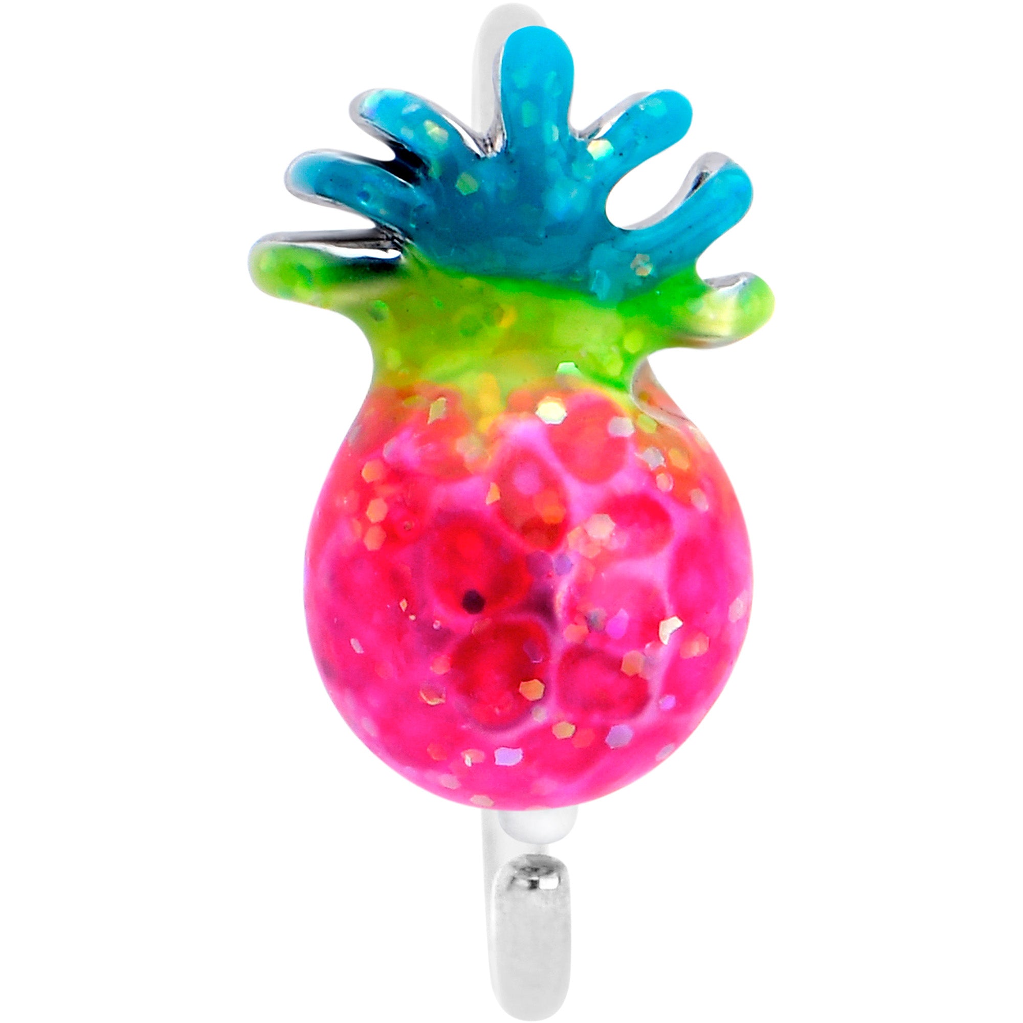 What could be sweeter than the ripe, juicy pineapple on this 20 gauge nostril ring? It's made with an 8mm durable 316L surgical grade stainless steel circular ring. It features a hot, hot pink fruit, with textured detailing. The pineapple is embellished with a yellow top and blue leaves for a trippy and tasty look. Get hot and juicy and totally sweet with this delicious looking nose piercing jewelry.