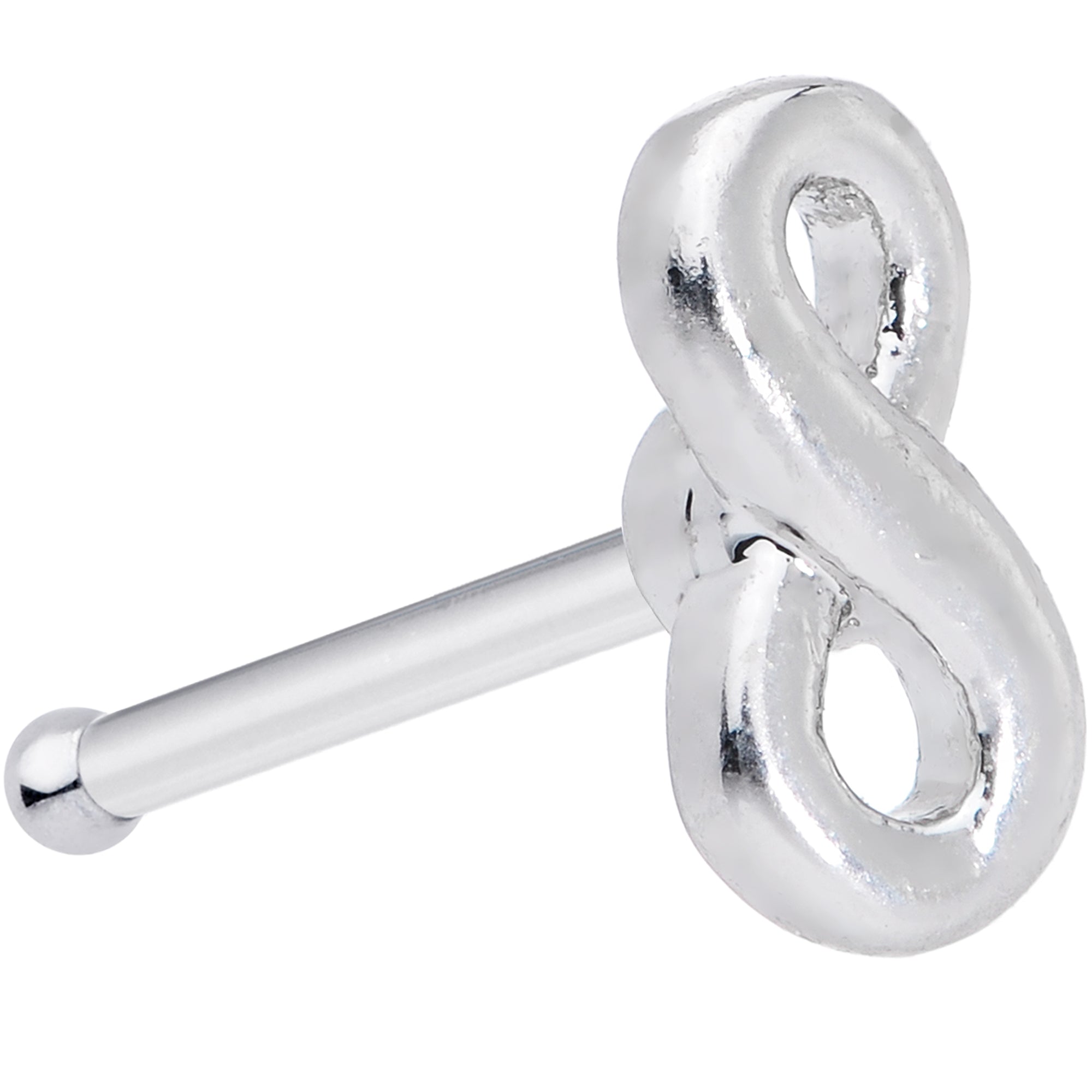 If your love of piercings will last until the end of time, this 20 gauge nose ring is perfect for you! It's made with an 8mm durable 316L surgical grade stainless steel straight post. It features a petite charm of a sideways figure 8, the symbol for infinity. This diminutive nostril jewelry shows the world that you'll love your nostril piercing forever...and then some!