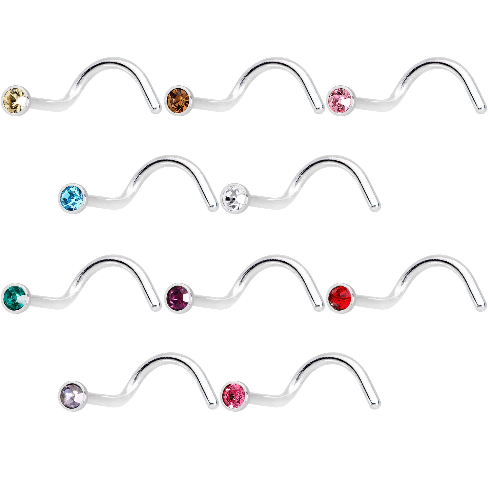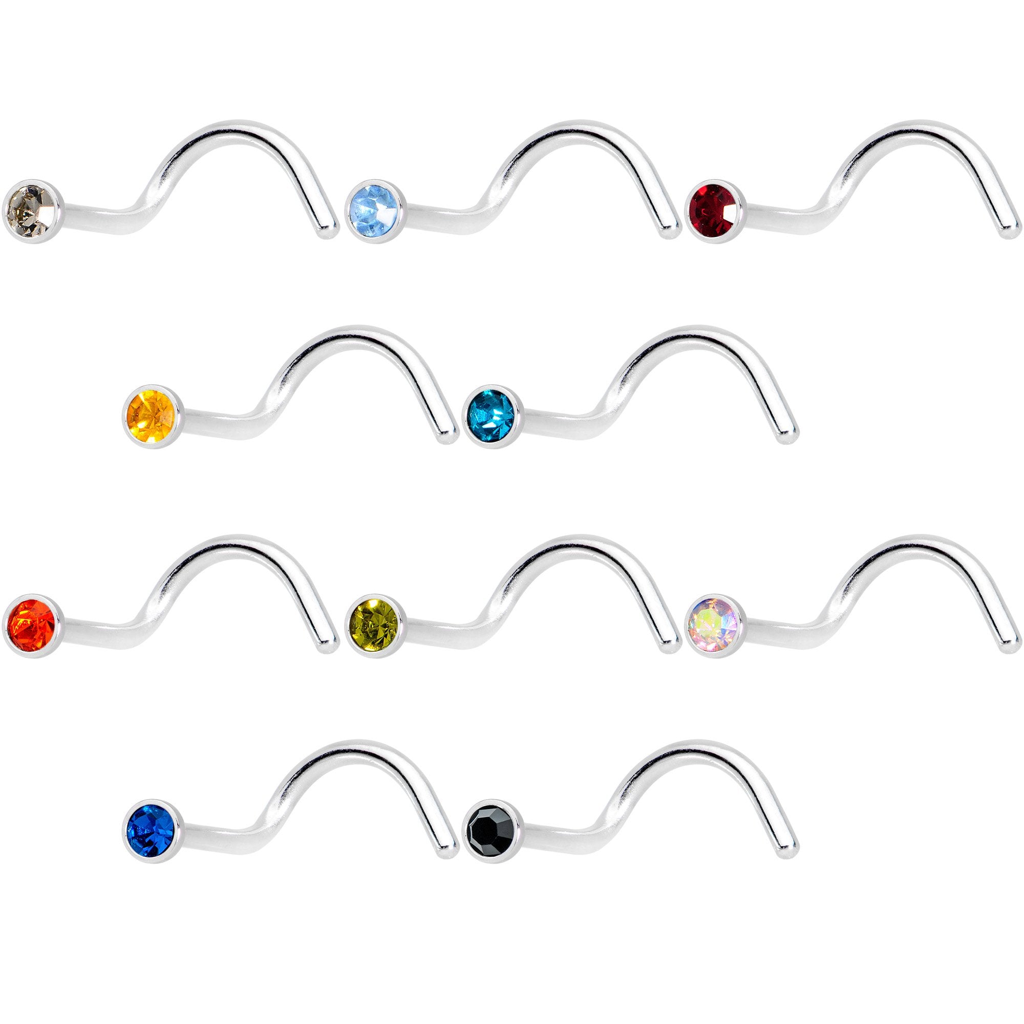 Gain endless style options for your pierced nose with this set of 20 nose rings in the screw design. These 20 gauge nose screws all have a length of 8mm and are made from durable 316L surgical grade stainless steel. Included in this package of 20 nostril rings is a beige stud, light blue stud, dark red stud, pink stud, orange stud, blue stud, dark blue stud, black stud, red stud, green stud, aurora stud, deep red stud, purple stud, deep pink stud, aqua blue stud, clear stud, emerald green stud, dark purple stud, light yellow stud, and brown stud.