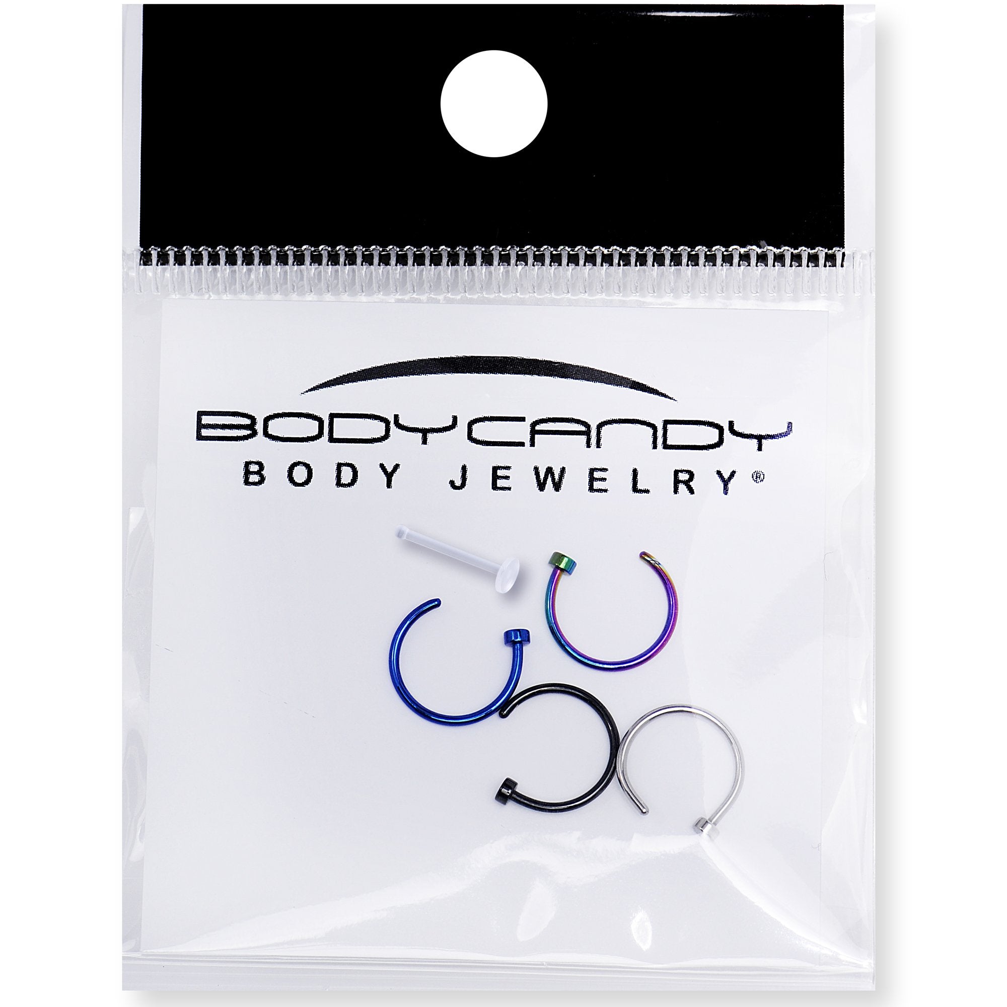 Tired of your old and boring nose jewelry? If you're looking to take your style up a notch without breaking the bank, this pack of 4 assorted nose hoops is perfect for your body jewelry collection. All four nose rings are 20 gauge and have a hoop diameter of 8mm in size. In this pack you will receive 3 anodized over 316L stainless steel nose hoops; one blue, one rainbow, and one black; as well as one durable 316L stainless steel nose hoop and a bonus clear flexible bioplast retainer. Grab this pack for endless fashion options that will have everyone getting nosey.