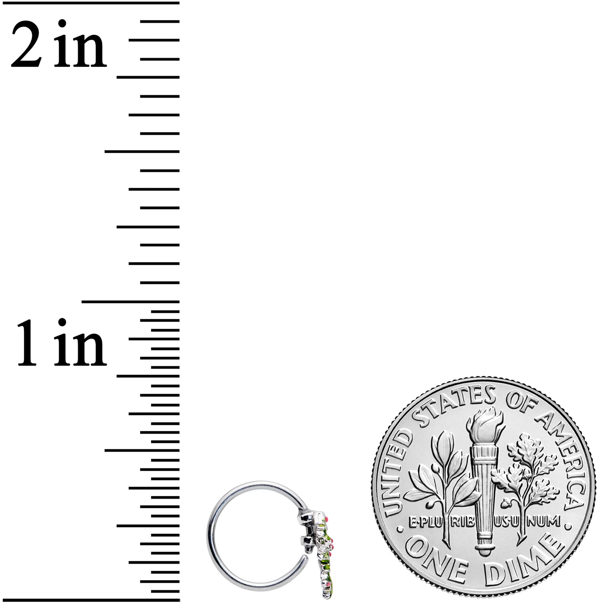 Bedeck your nostril piercing with Christmas candy on this 20 gauge nostril ring! It's made with an 8mm durable 316L surgical grade stainless steel circular ring. It features a candy cane charm, wound with a green strand of holly. The holly is embellished with pink cubic zirconia gems for a colorful replacement for holly berries! This candy cane is one that you'll want to keep around all year long!