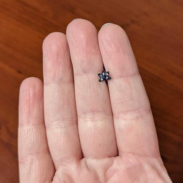 Fall in love with all things dark and creepy with this 20 gauge nostril ring! It's made with an 8mm black PVD over 316L surgical grade stainless steel circular ring. It features a blooming floral charm. Each of the petals is set with a purple gem. At the center of the flower is a tiny skull, embellished with raised detailing. This is one nose piercing ring you'll love all the way down to the bone!