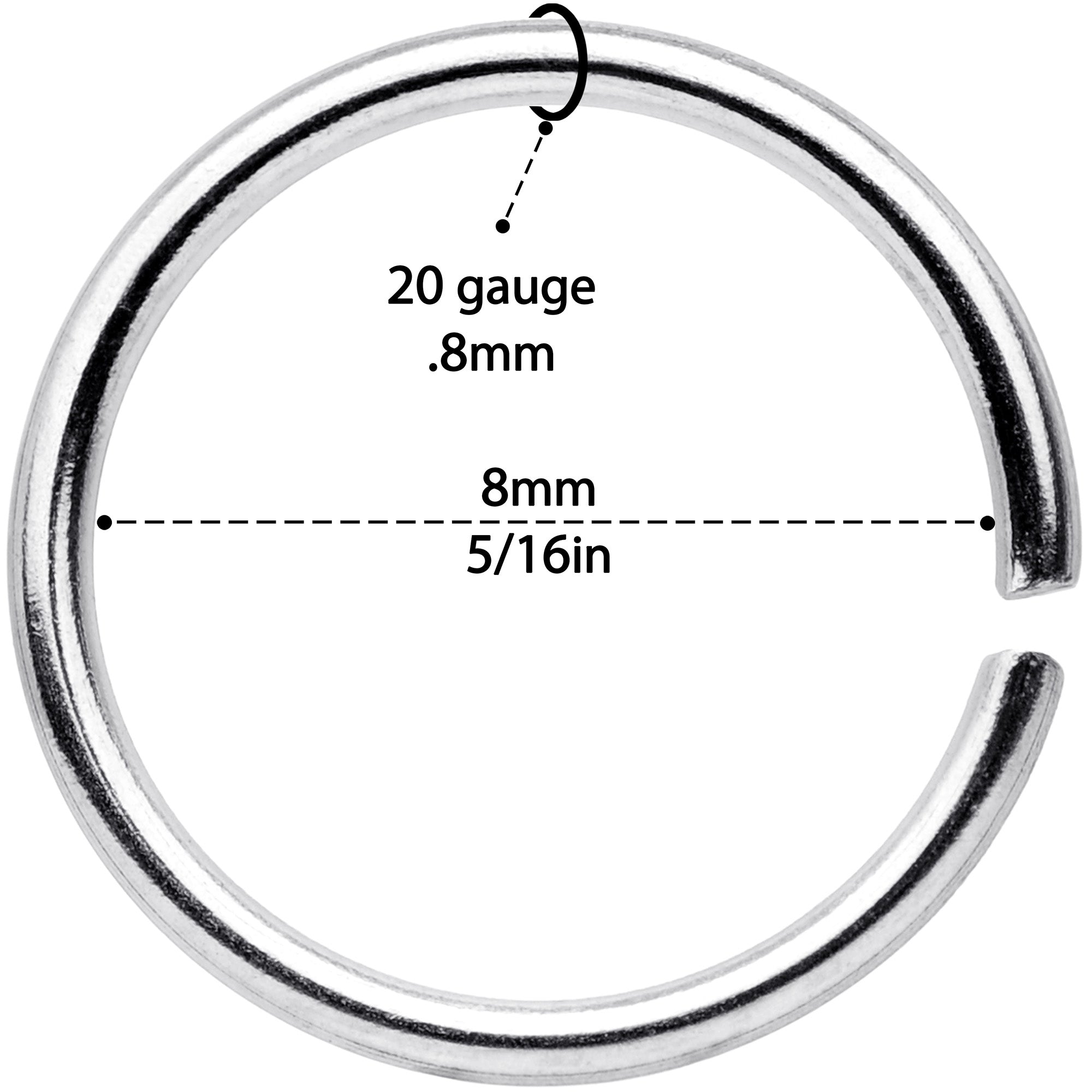 Whether you have multiple nostril piercings and prefer a matching look or are simply prone to losing things, this set of 20 gauge nose rings has you covered. Six are made with 8mm black anodized over 316L surgical grade stainless steel circular rings for a colorful and comfortable feel. The other six are made with 8mm durable 316L surgical grade stainless steel seamless circular rings for a traditional appearance. This nostril jewelry is super easy to insert and remove - simply twist the ring open, insert, and then twist gently shut again. And with so many in the set, you can be sure of always having a beautiful nose ring to wear! Sold as a set of twelve. These are universal seamless rings for multiple body piercings including ear, lip and septum or nose.