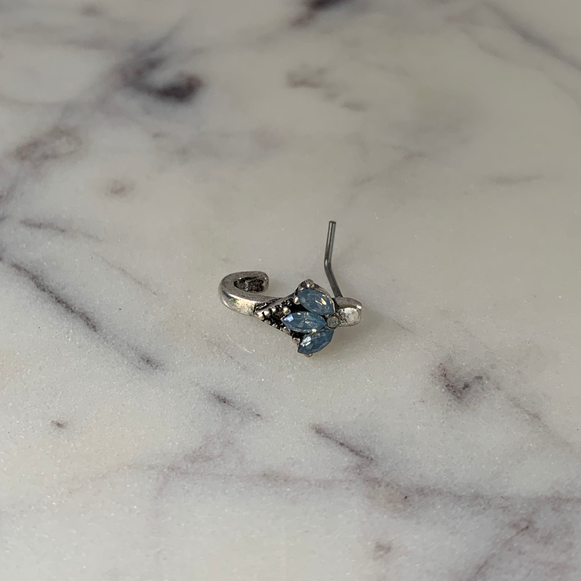 Sometimes you want the look without the commitment....like this 20 gauge nose jewelry! It's made with an 8mm length at the bend 316L surgical grade stainless steel L-shaped post. It features a trio of oval shaped blue faux opals, for a look that's super on-trend. It's further embellished with textured silver-tone detailing and features a curving portion that emulates the look of a hoop with the fit of an L-shaped nose ring. Get the look you want for only as long as you want it for with this elegantly deceptive nostril jewelry!