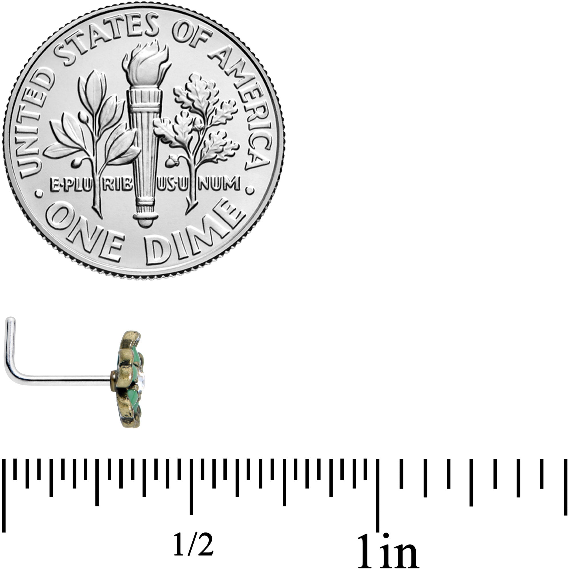 Let your look bloom in its own unique way with this 20 gauge nostril ring! It's made with a .29" length at the bend 316L surgical grade stainless steel L-shaped post. It features a flower charm with openwork petals. The petals are embellished with green orbs and it has a clear gem at the center. Rock some nostril jewelry that's as lovely and unique as you are with this fantastic flower nostril piercing ring!