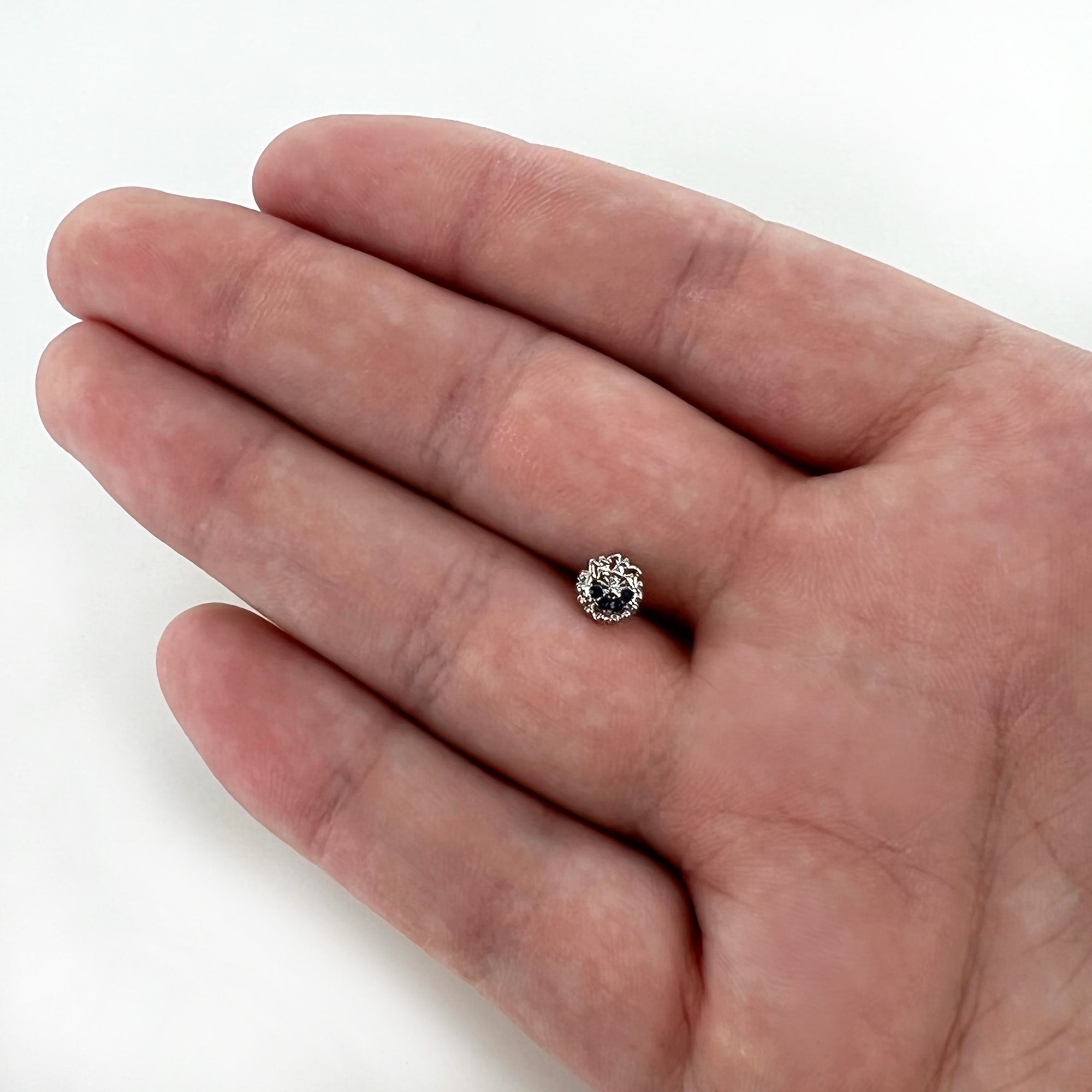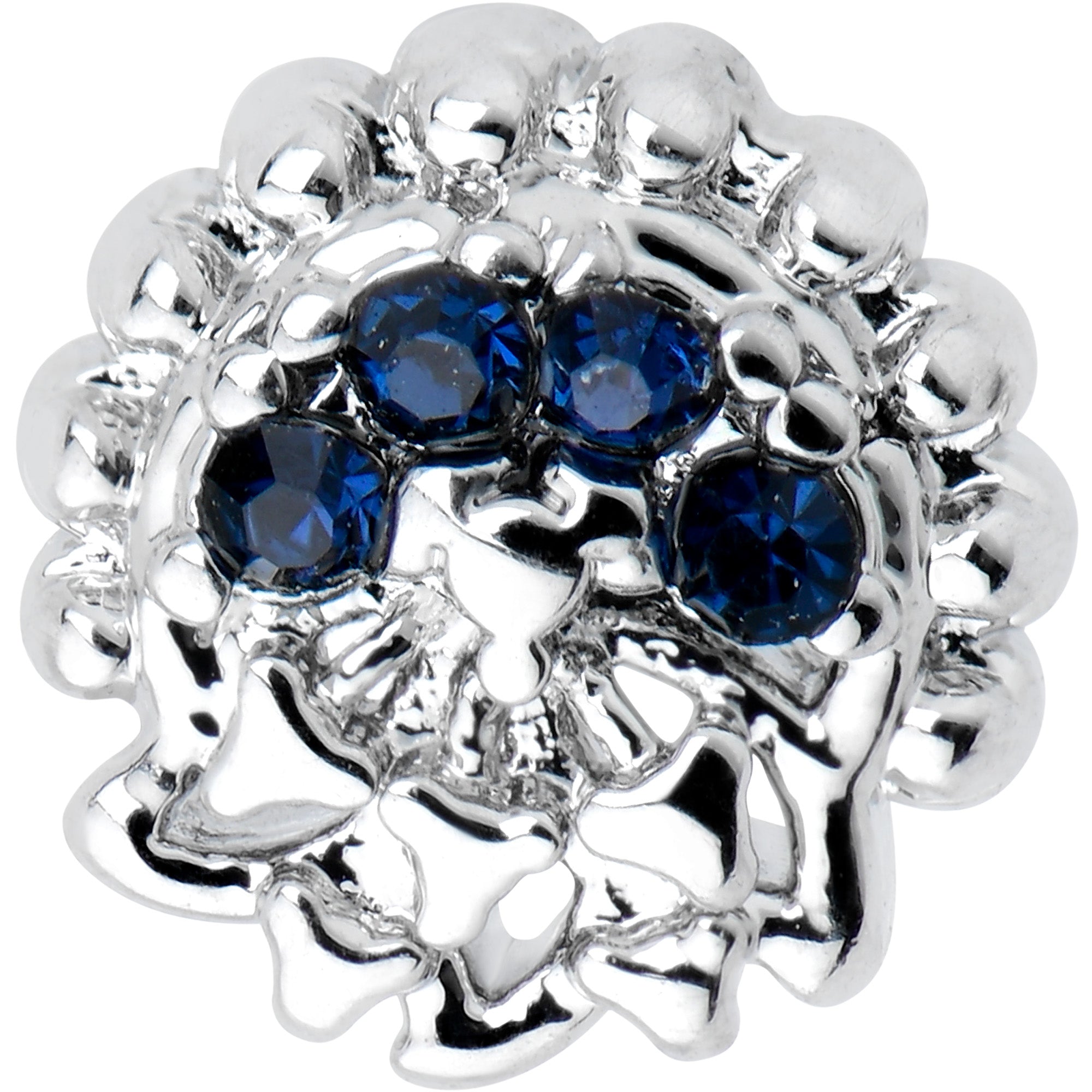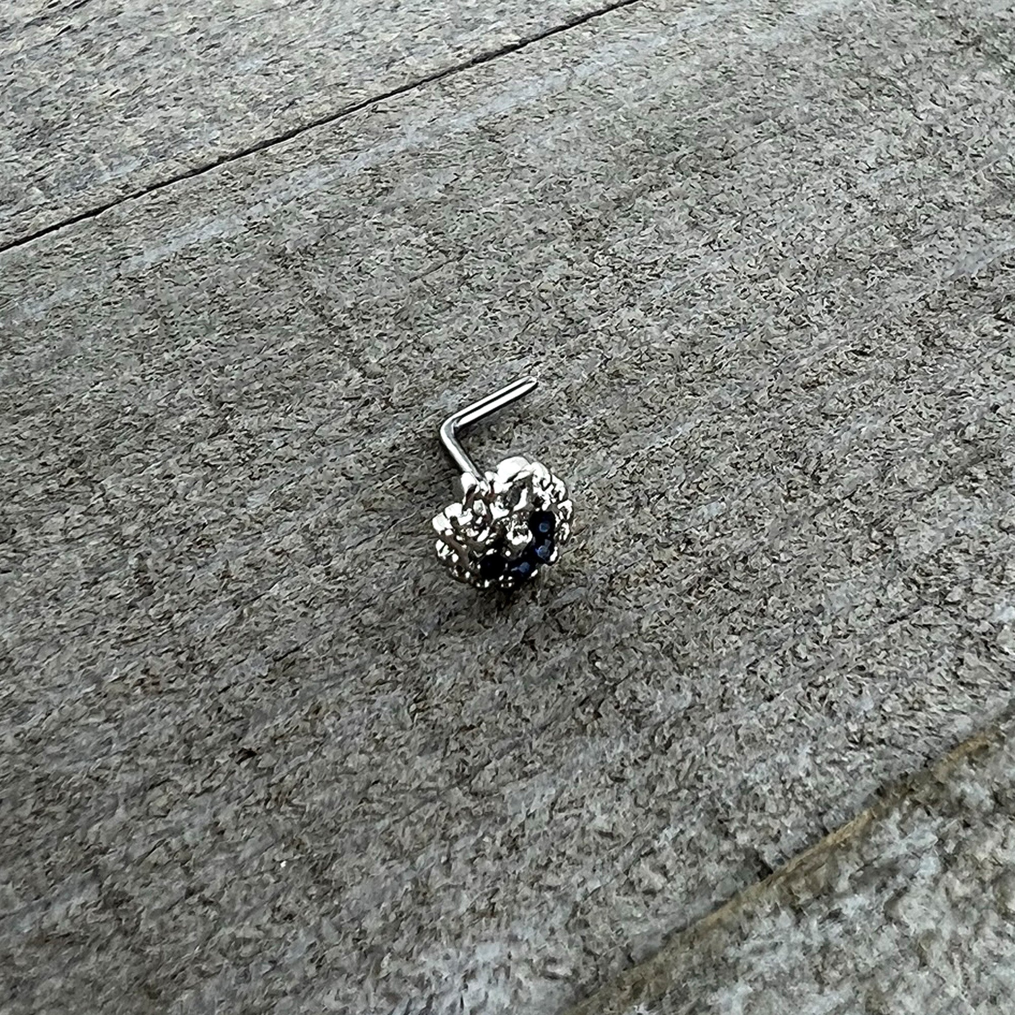 The curve on this 20 gauge nostril ring is sure to catch eyes! It's made with a .27" length at the bend 316L surgical grade stainless steel L-shaped post. It features an abstract arch charm, with the outermost rim set with textured embellishment and the inner curve set with deep blue gems. Below that is an abstract flower design with a clear gem center. Get abstract with this elegant nose piercing ring!