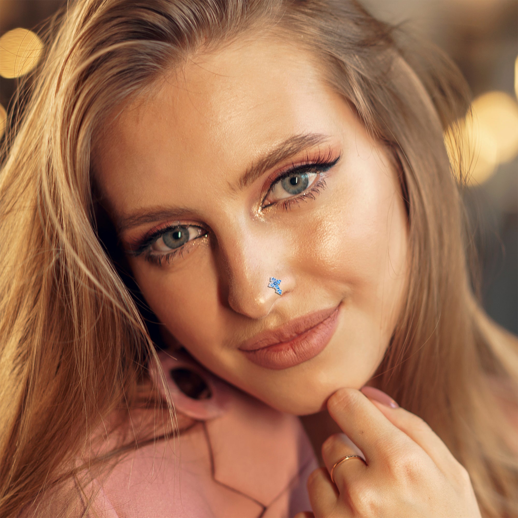 Rock some spiritual style with this 20 gauge nostril ring. It is made with an .27 inch length at the bend 316L surgical grade stainless steel L-shaped post. It features a cross charm, composed of blue cubic zirconia gems and featuring a stylized design for an extra elegant look. You can rock your personal beliefs and look like a million bucks when you are rocking this cross themed nose piercing jewelry.