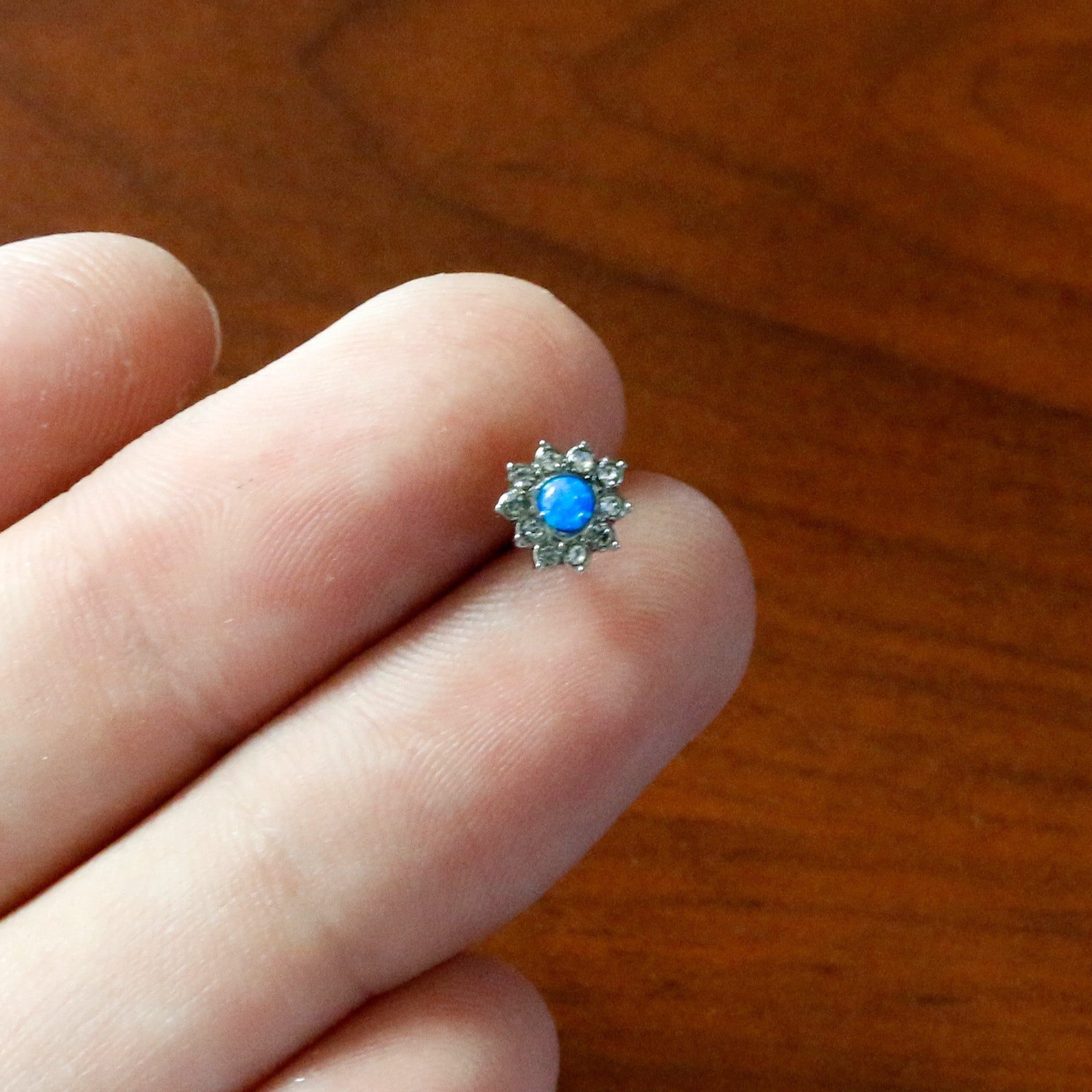 Add some sun and some love to your day with this 20 gauge nostril ring! It's made with a .27" length at the bend 316L surgical grade stainless steel L-shaped post. It features a sun charm, with each ray set with a clear cubic zirconia gem. Within the center of the sun is a blue faux opal orb. Brighten up your nose piercing with a sunny nose ring you can't help but fall in love with!