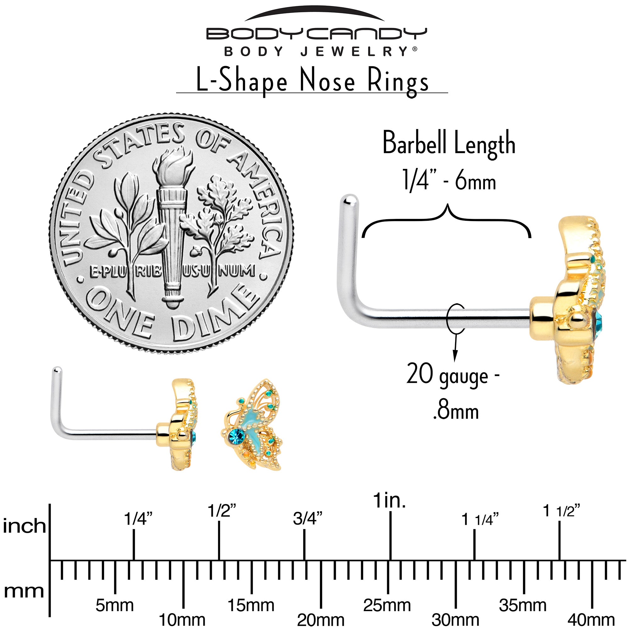 Spread your wings with this 20 gauge nostril ring. It is made with an 0.27 inch length at the bend 316L surgical grade stainless steel L-shaped post. It features a butterfly charm, with intricate textured detailing and a blue gem embellishment. It is further embellished with a ribbon design for a truly eye-catching look. Let your look soar with this elegantly styled nose piercing jewelry.